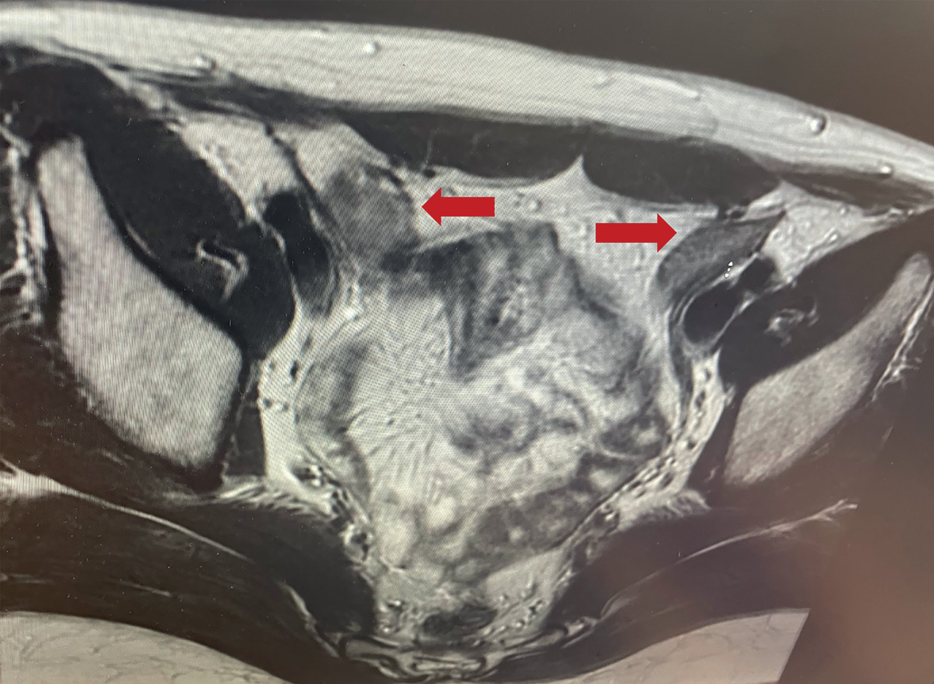Figure 1. MRI of the pelvic organs. Arrows indicate the gonads (testes) in the inguinal canal.