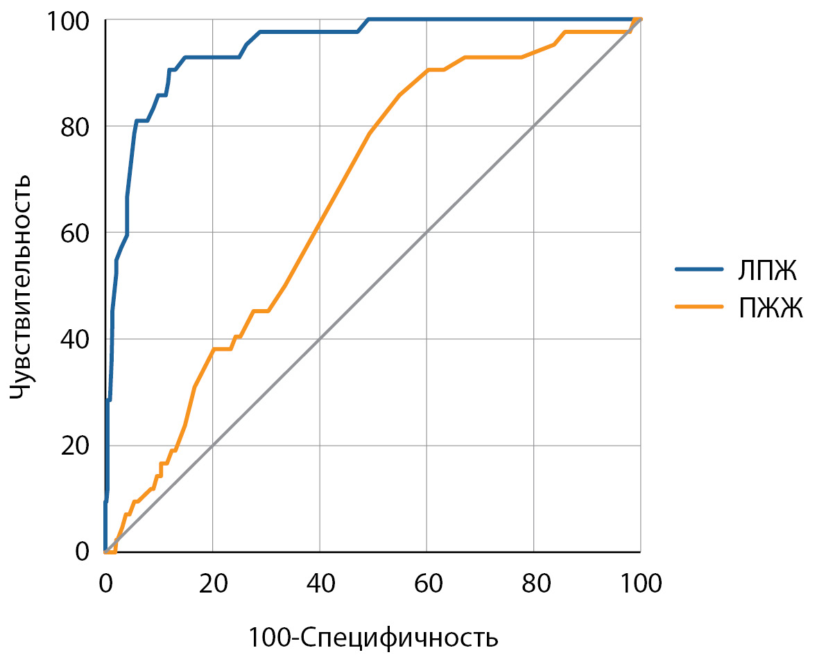 Figure 1. Receiver operating characteristic curves for left atrial (ЛПЖ) and right ventricular fat (ПЖЖ) thickness as predictors of left atrial appendage thrombosis.
