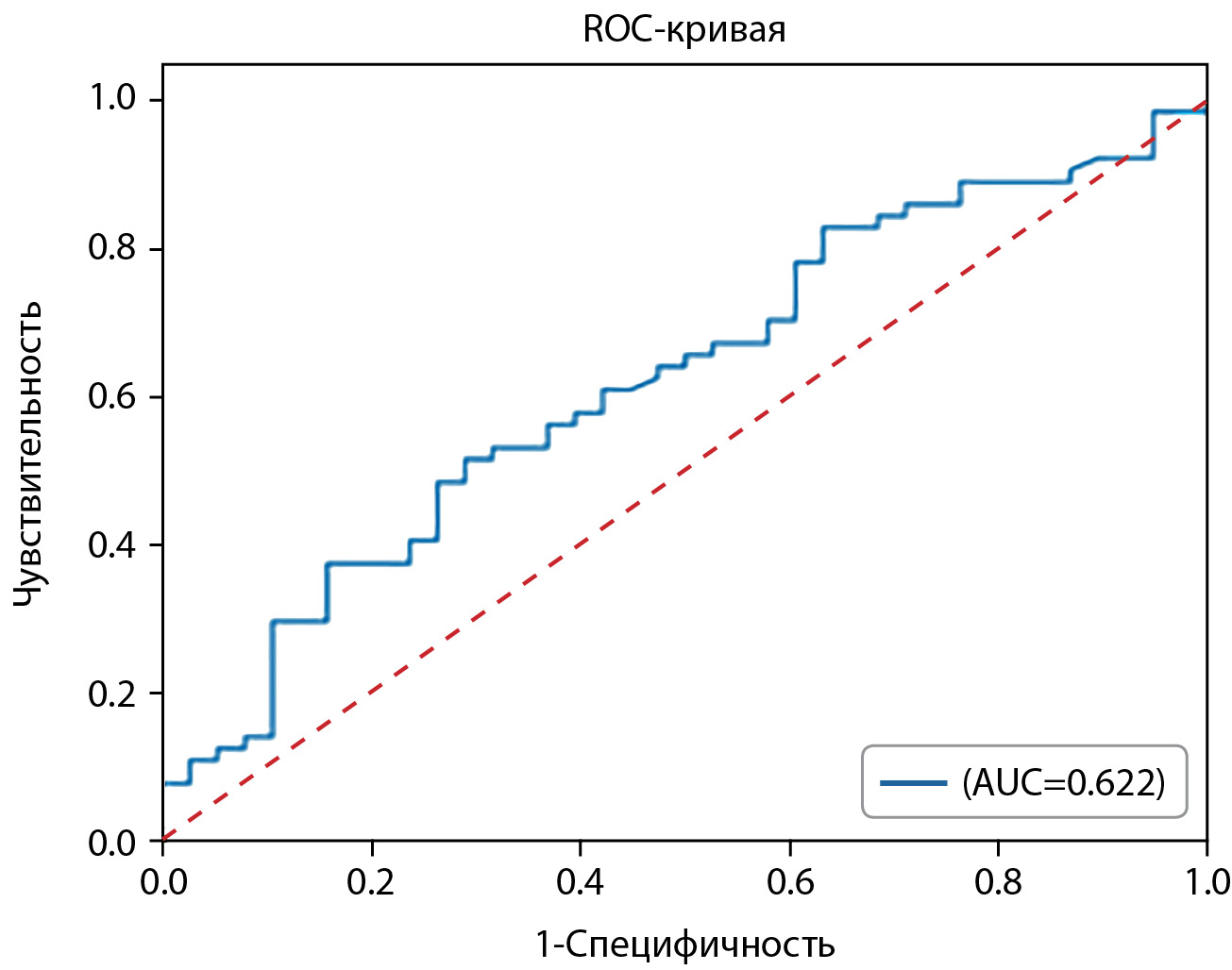 Далее был проведен ROC-анализ для ИМТ, как параметра, отражающего различиям между группами на уровне статистической тенденции. ROC-анализ представлен на рисунке 1.