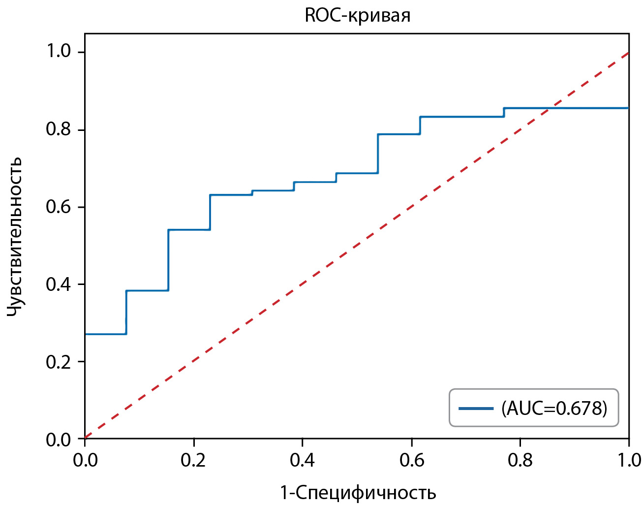 Далее был проведен ROC-анализ для параметра, обладающего статистической тенденцией к различиям между группами (ИМТ). ROC-анализ представлен на рисунке 2.