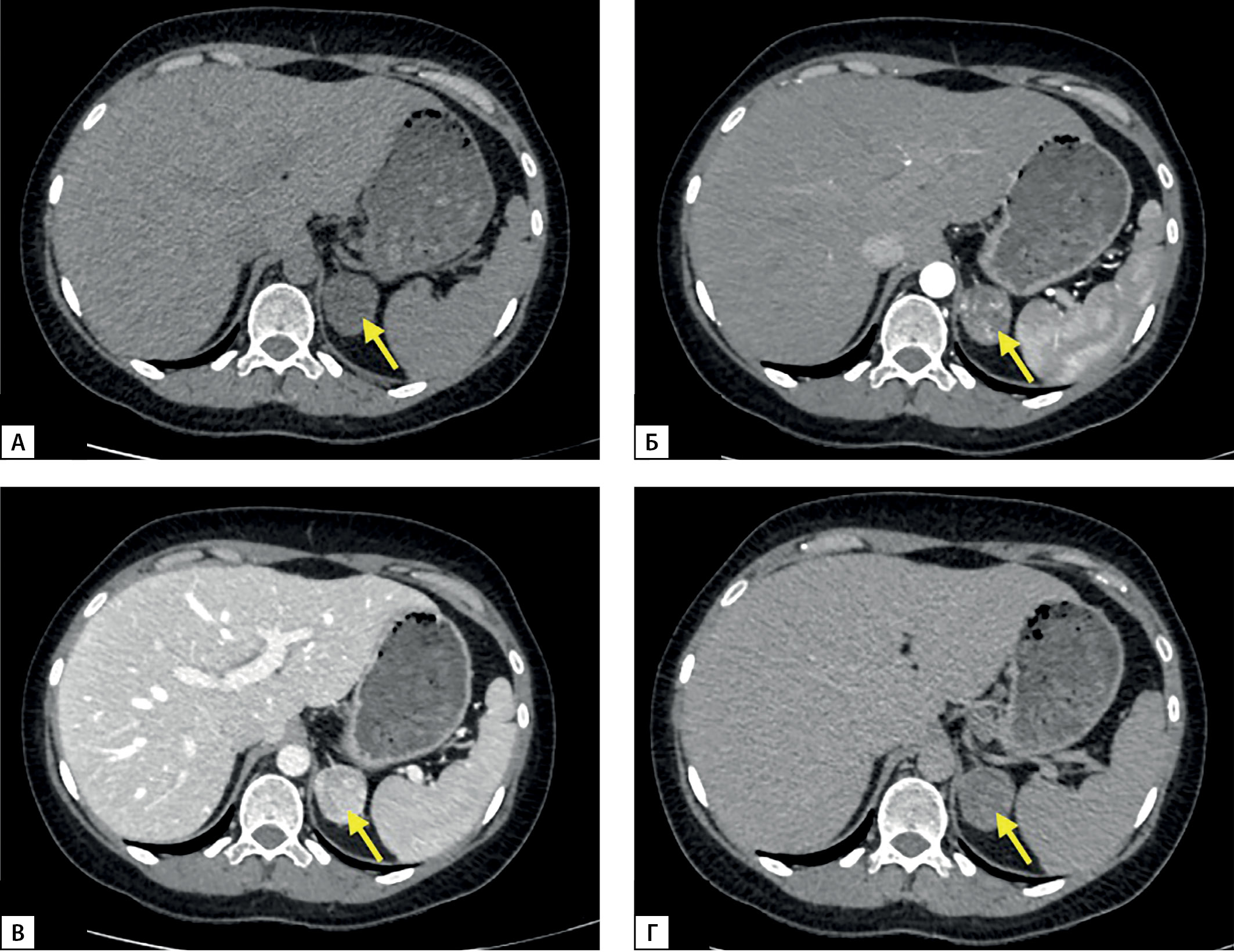 Рисунок 1. МСКТ надпочечников: А — нативная фаза; Б — артериальная фаза; В — венозная фаза; Г — отсроченная фаза.