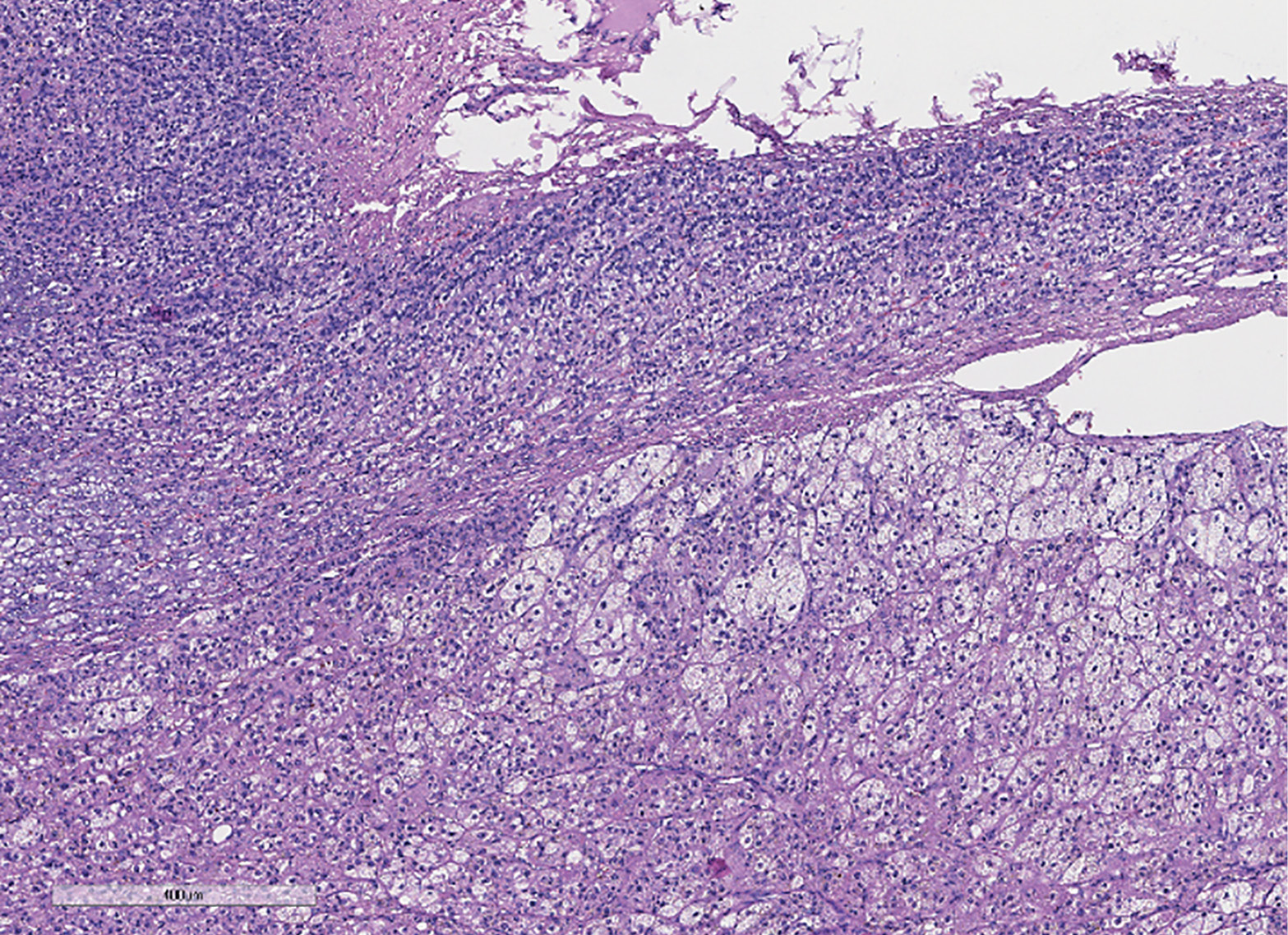 Figure 2. Histopathological study of the adrenal gland. An unevenly thickened adrenal gland is adjacent to a non-encapsulated, well-demarcated tumor consisting of compact cells and cells with optically «empty» cytoplasm, with a trabecular or alveolar structure (stained with hematoxylin and eosin, x400).