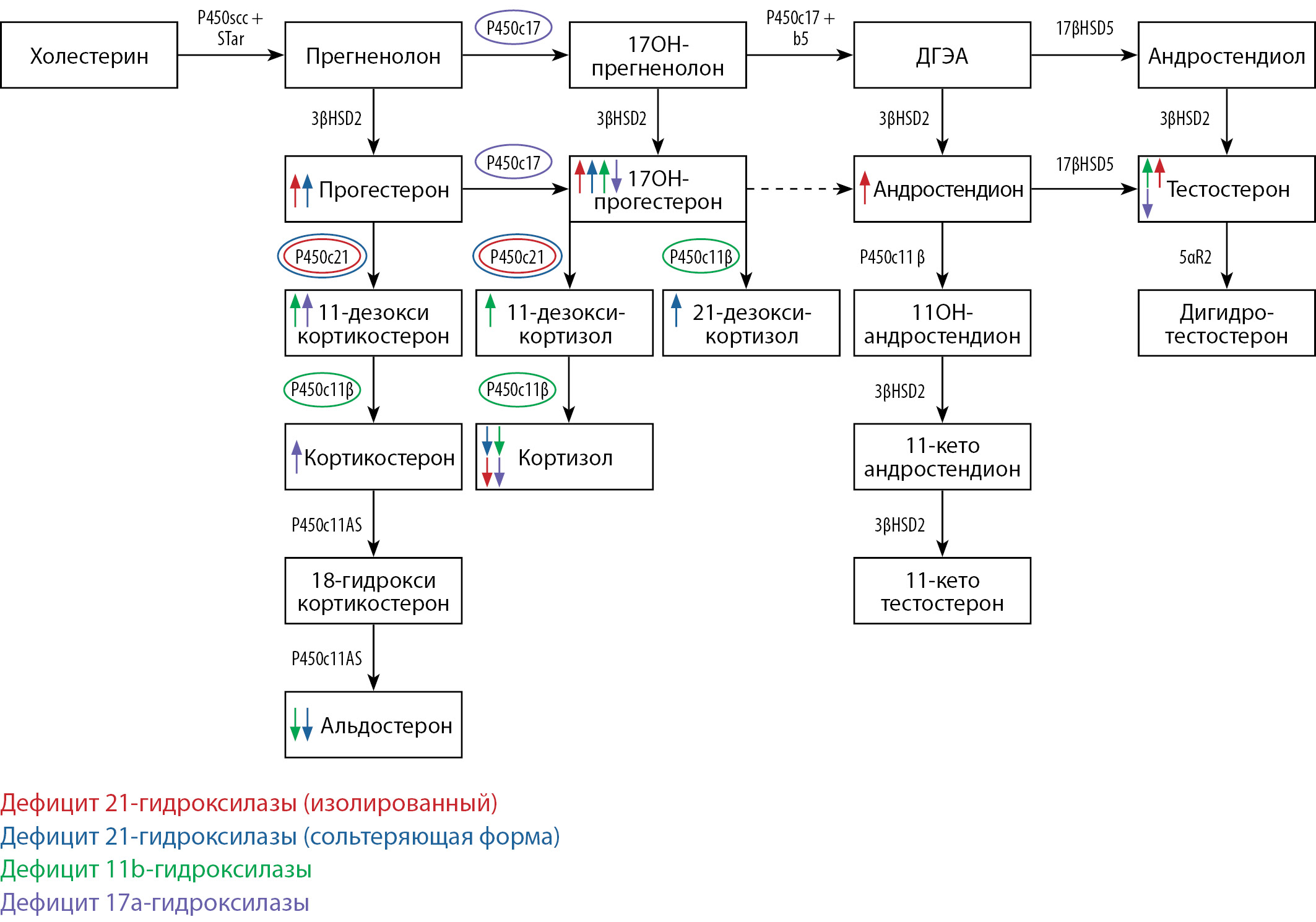 При дефиците 21-гидроксилазы определяется повышение 17-OHP в сочетании с андростендионом и тестостероном, снижение кортизола, при сольтеряющей форме — дополнительно повышается 21-дезоксикортизол, снижается альдостерона, при дефиците — 11β-гидроксилазы: повышение 11-дезоксикортикостерона (основной маркер), 11-дезоксикортизола, тестостерона, снижение альдостерона. Для дефицита 17a-гидроксилазы характерно снижение кортизола, андрогенов, в том числе 17-OHP, тестостерона, повышение предшественников минералокортикоидов: 11-дезоксикортизола, кортикостерона.