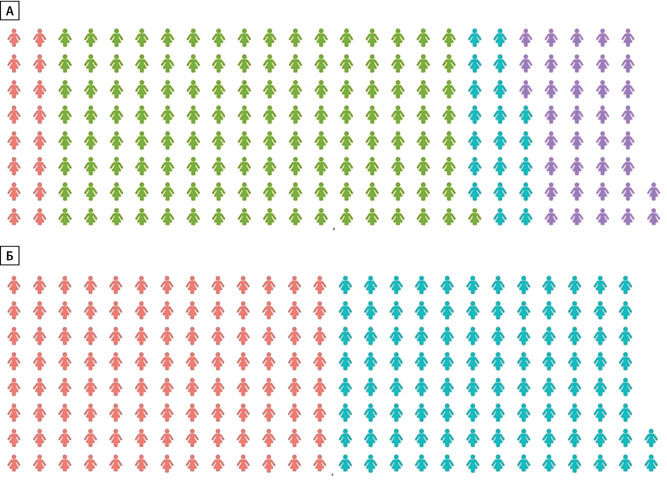 1. Рисунок 1. Распространенность нутритивных статусов в группе из 202 женщин 18–67 лет, проживающих в г. Москве. А — нутритивный статус диагностирован по значению ИМТ. Красный — недостаток массы тела, зеленый — нормальная масса тела, фиолетовый — избыточная масса тела, голубой — ожирение. Б — ожирение диагностировано по доле жировой массы тела, определенной в ходе биоимпедансометрии. Красный — нет ожирения %ЖМ<30, голубой — ожирение %ЖМ≥30.
