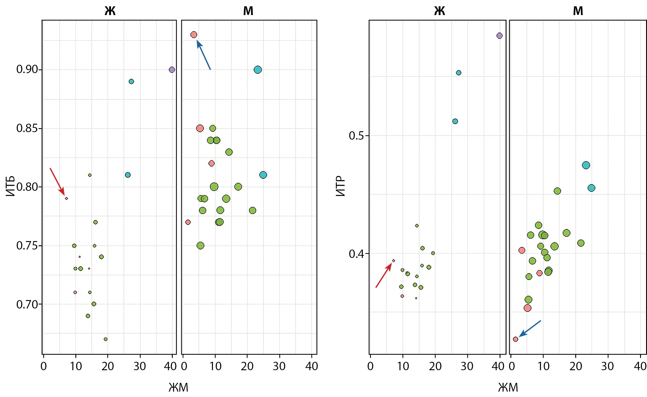 2. Рисунок 2. Взаимосвязь ИТБ и ИТР с абсолютным значением жировой массы, определенной методом биоимпедансометрии (интегральная схема, АВС-02 Медасс, «Медасс», РФ) в группе юношей и девушек в возрасте от 18 до 20 лет. Красным, зеленым, голубым и фиолетовым цветом обозначены соответственно недостаточная, нормальная, избыточная масса тела и ожирение. Нутритивный статус диагностирован по значению ИМТ.