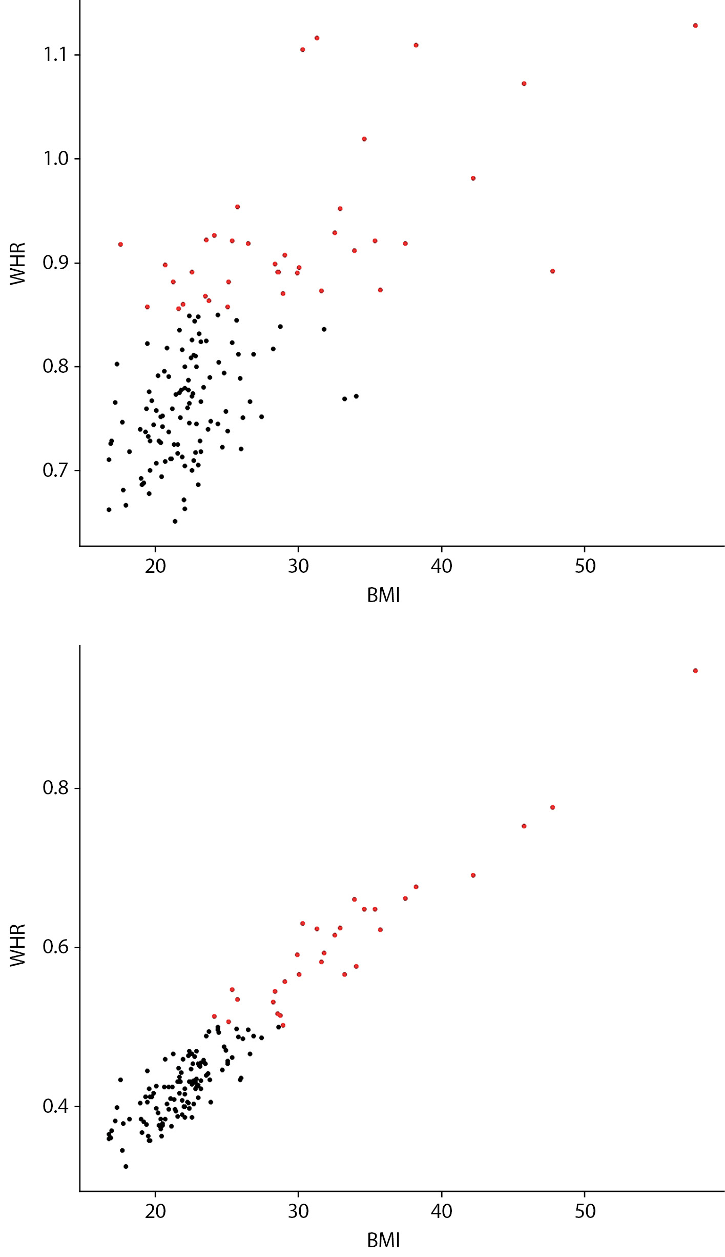 3. Рисунок 3. Распределение А — ИТБ; Б — ИТР от ИМТ (BMI) в группе взрослых мужчин и женщин, проживающих в г. Москве. Красным обозначены обследованные с превышением рекомендованных пороговых значений для данных индексов.