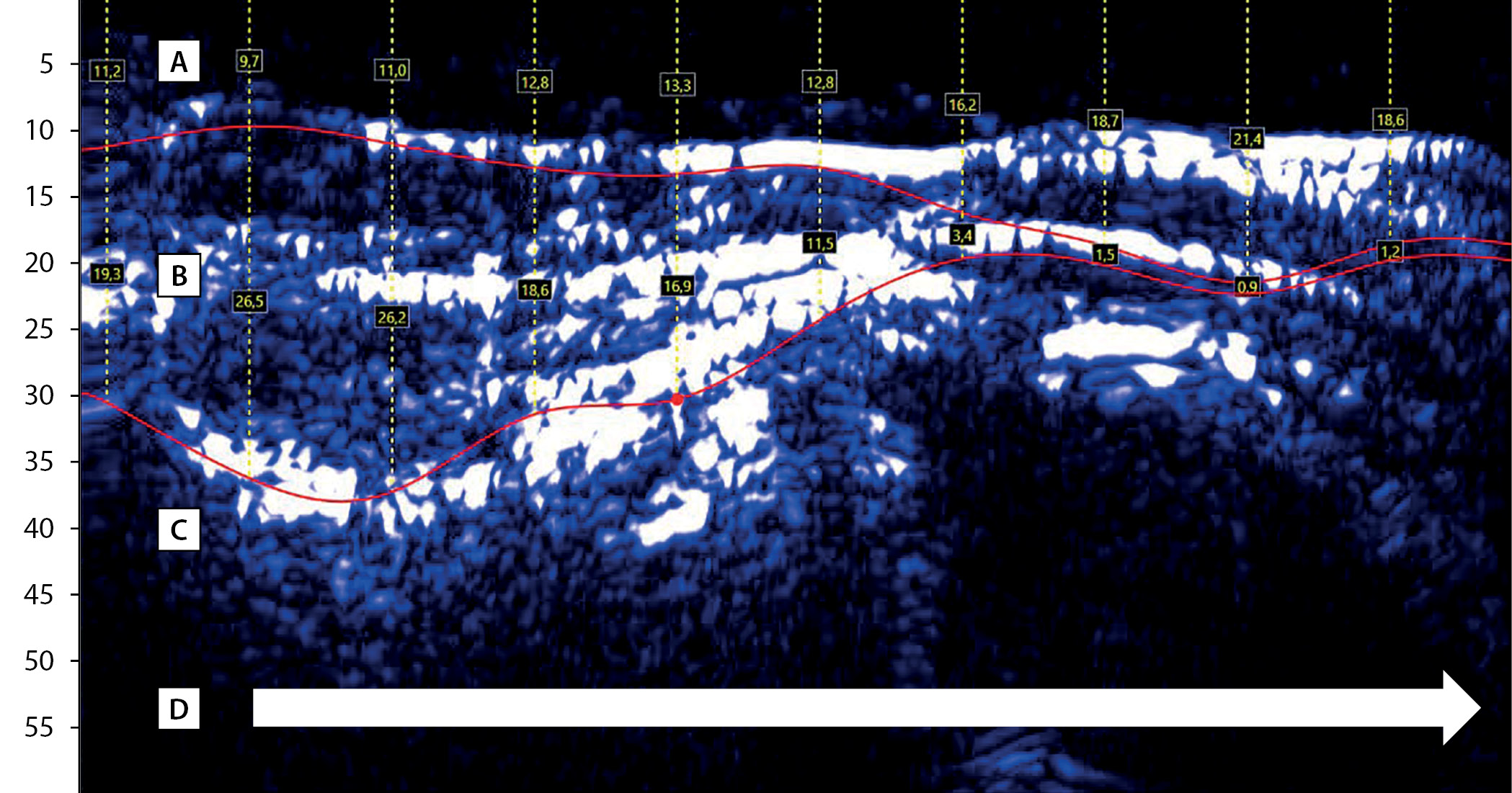 4. Рисунок 4. Изображение поверхностного и глубокого слоев подкожной жировой клетчатки в области талии, полученное в режиме сканирования с применением ультразвукового сканера BodyMetrixTM BX2000. Женщина 35 лет (г. Москва), скрытое ожирение. A — наружный слой подкожной жировой клетчатки; B — глубокий слой подкожной жировой клетчатки; C — прямая мышца живота; D — полость тела. Красная линия между A и B — фасция Скарпа; красная линия между B и C — граница между подкожной жировой клетчаткой и прямой мышцей живота. Белая стрелка указывает направление движения сканера от пупка к тазовому гребню.