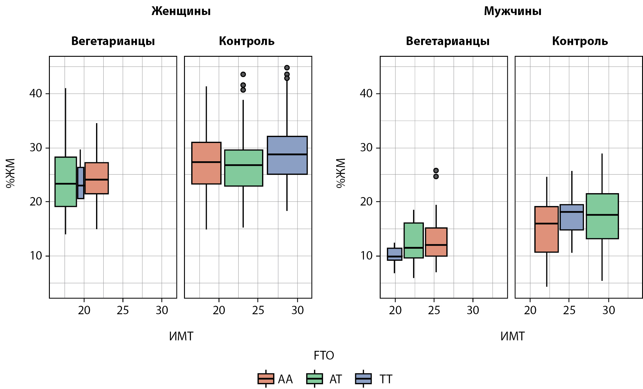 5. Рисунок 5. Распределение значений доли жировой массы тела (%ЖМ) в зависимости от значения ИМТ в подгруппах мужчин и женщин, придерживающихся вегетарианской и традиционной (контроль) диеты и имеющих различные генотипы FTO.