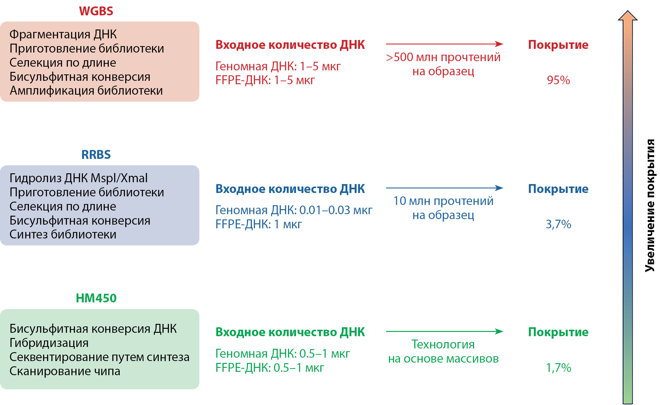 Примечание. На рисунке сравниваются максимальный охват полногеномного бисульфитного секвенирования (WGBS, оранжевый; наибольший геномный охват), бисульфитного секвенирования ограниченных наборов геномных локусов (RRBS, синий) и подхода, основанном на технологии ДНК-чипов Infinium HumanMethylation450 BeadChip (HM450, зеленый). Показано краткое описание стандартного рабочего процесса для каждого метода (цветные прямоугольники слева). Количество геномной ДНК, выделенной из фиксированной формалином ткани, залитой в парафин (FFPE), необходимое для надежного выполнения каждого метода, надежно колеблется от 0,01 мкг (RRBS) до 5 мкг (WGBS), что может влиять на выбор платформы. Минимальное количество прочтений варьируется от 10 миллионов чтений (RRBS) до >500 миллионов чтений (WGBS), тогда как платформа HM450 использует технологию массивов. Таким образом, стоимость каждого метода примерно пропорциональна объему данных, необходимому для надежного анализа данных, и охвату генома [диапазон 1,7% (HM450) — 95% (WBGS)].
