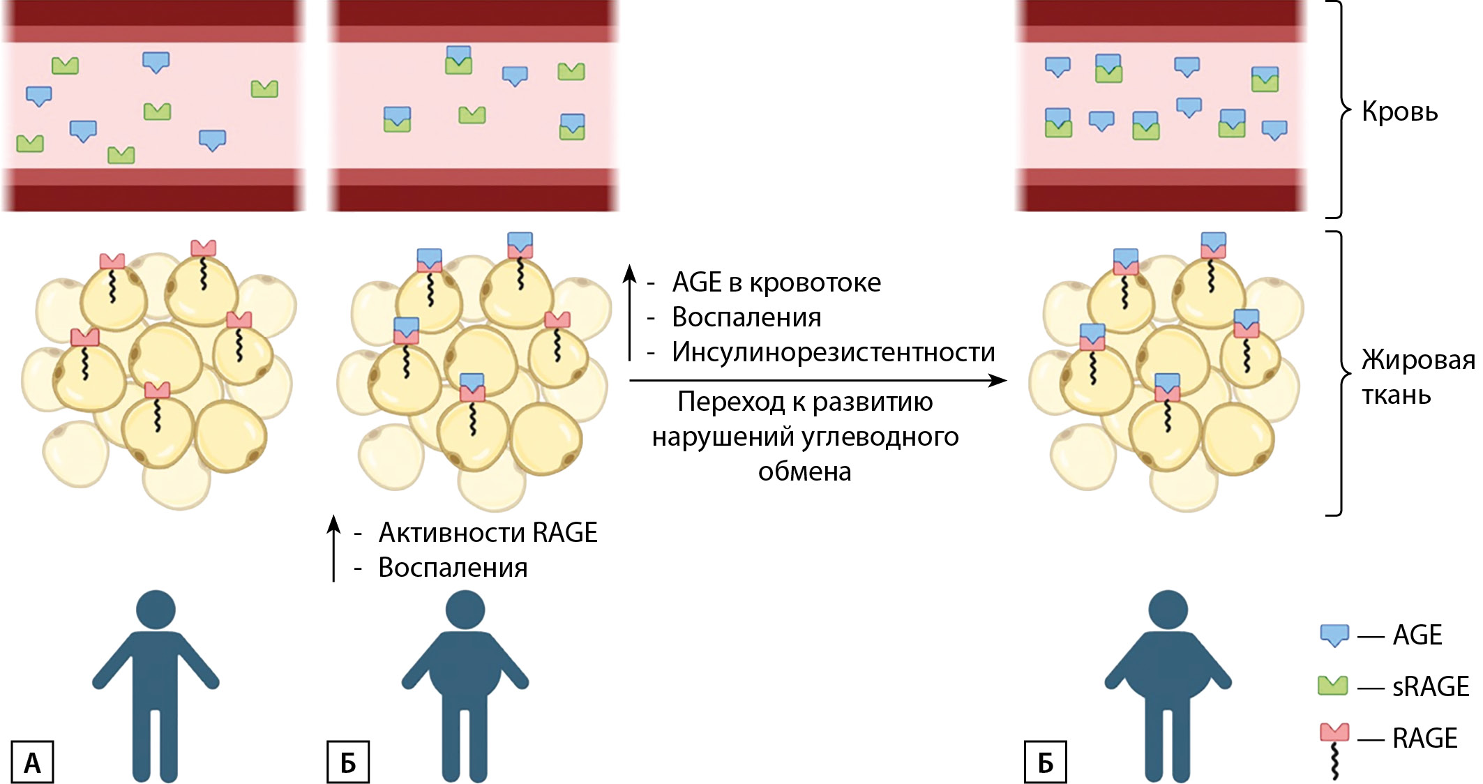 Б — при увеличении массы тела концентрации AGE и sRAGE в крови снижаются в связи с образованием комплексов AGE-sRAGE, AGE-RAGE и накоплением AGE в ЖТ. Вследствие связывания AGE с RAGE усиливается воспаление.