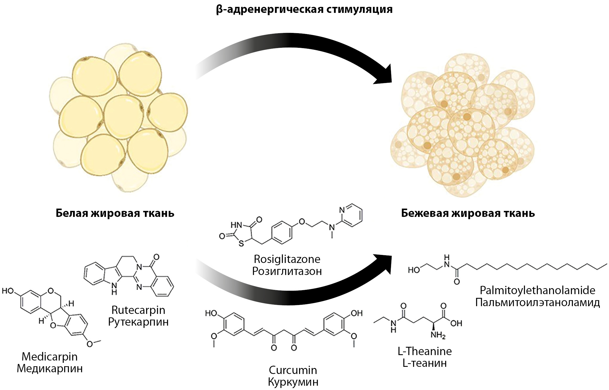 Одним из перспективных подходов может стать стимуляция перехода белых жировых клеток в более катаболически активные бежевые с использованием препаратов на основе малых молекул, а также с помощью добавления физиологически активных нутриентов в диету. Конверсия белых адипоцитов в бежевые широко исследуется и называется побурением [9]. Влияние на конверсию жировых клеток с помощью небольших молекул, воздействующих (активирующих или ингибирующих) на молекулярные мишени, участвующие в биогенезе жировой ткани, представляет собой простой неинвазивный метод, который в настоящее время активно изучается.