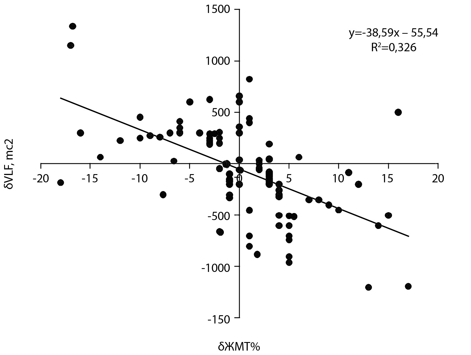 Изменение VLF (%) на 25% связано с изменением ЖМТ% (R2=0,253, р<0,01). Из рис. 2 видно, что при увеличении дельт ЖМТ% снижается дельта относительной (VLF%) мощности колебаний очень низкочастотной составляющей кардиоритма. Коэффициент корреляции (r=–0,503, р<0,001) также указывает на умеренную силу отрицательной связи между этими показателями.