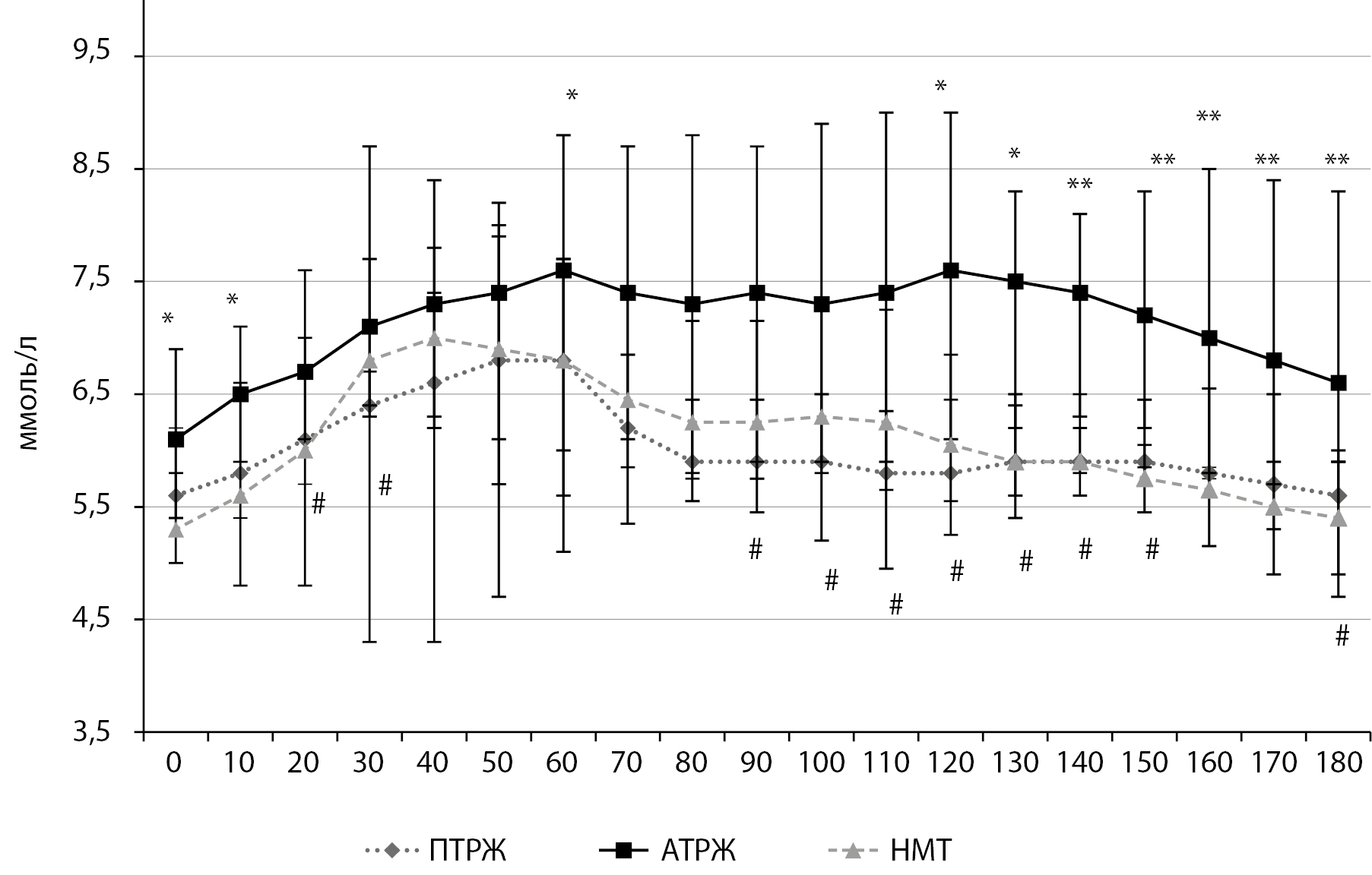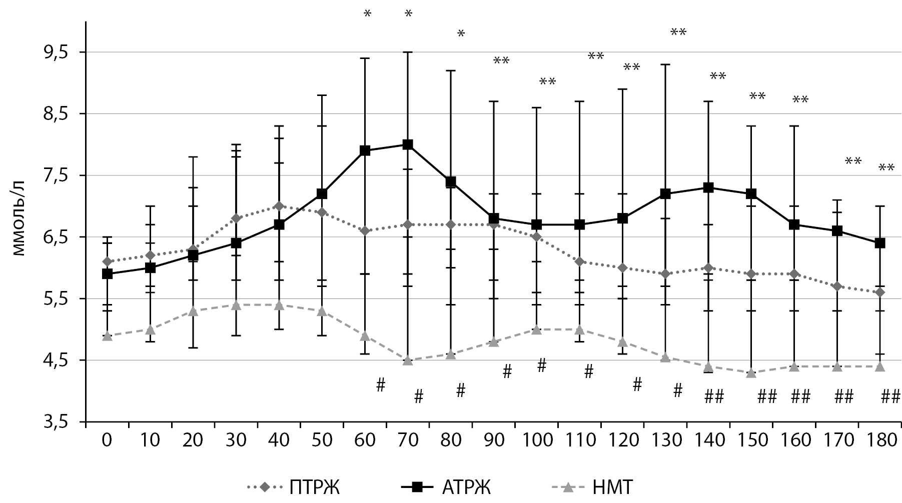 Анализ гликемической кривой после приема пробного углеводного обеда (рис. 2) показал, что у мужчин с ПТРЖ уровень глюкозы был несколько ниже относительно мужчин с АТРЖ, но достоверной разницы на протяжении 3 часов выявлено не было. Пик глюкозы у мужчин с ПТРЖ приходился на 50 минуту, а у мужчин с АТРЖ, как и в завтрак, на 70 минуту. После данного приема пищи у мужчин с ПТРЖ уровень глюкозы достигал исходного к 160 минуте, а у мужчин с АТРЖ — только к 180 минуте. Начиная с 130 минуты уровень гликемии у мужчин с АТРЖ был достоверно выше относительно мужчин с НМТ, существенной разницы по уровню глюкозы между мужчинами с ПТРЖ и НМТ после обеденного приема углеводной пищи выявлено не было.