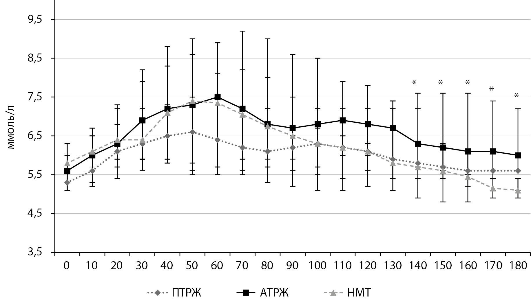 Анализ гликемической кривой после приема пробного углеводного обеда (рис. 2) показал, что у мужчин с ПТРЖ уровень глюкозы был несколько ниже относительно мужчин с АТРЖ, но достоверной разницы на протяжении 3 часов выявлено не было. Пик глюкозы у мужчин с ПТРЖ приходился на 50 минуту, а у мужчин с АТРЖ, как и в завтрак, на 70 минуту. После данного приема пищи у мужчин с ПТРЖ уровень глюкозы достигал исходного к 160 минуте, а у мужчин с АТРЖ — только к 180 минуте. Начиная с 130 минуты уровень гликемии у мужчин с АТРЖ был достоверно выше относительно мужчин с НМТ, существенной разницы по уровню глюкозы между мужчинами с ПТРЖ и НМТ после обеденного приема углеводной пищи выявлено не было.