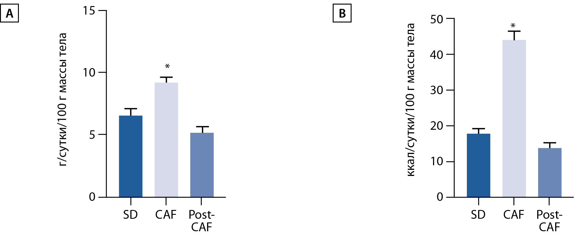 Рисунок 1. Потребление корма (А) и калорий (В) в контрольной (SD) группе, группе животных, находящихся на диете (CAF), и после перехода на стандартный корм (Post-CAF). Данные представлены в виде среднего значения ± SEM (one-way ANOVA, post-hoc Bonferroni test).