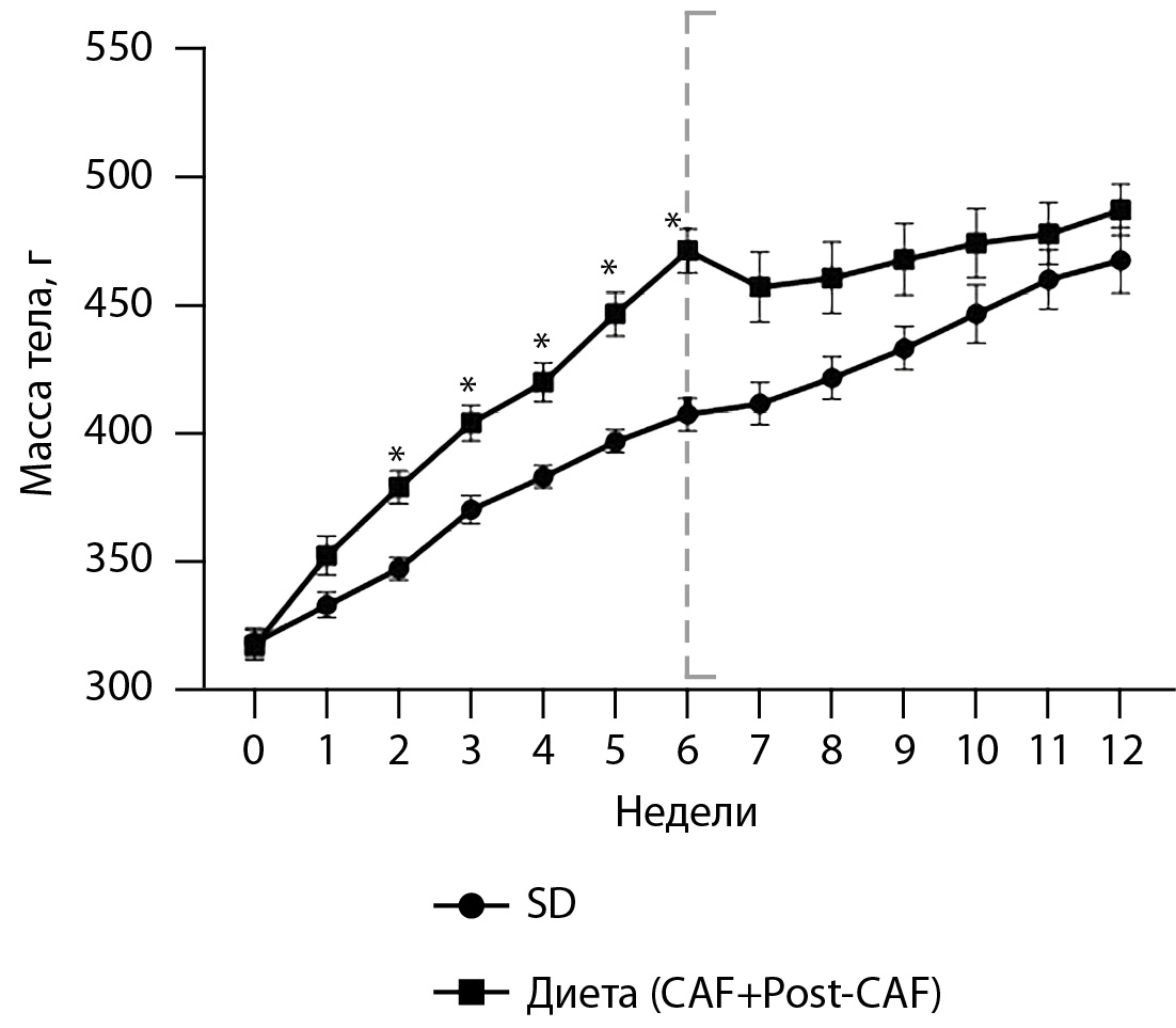 Рисунок 2. Динамика изменения массы тела в течение эксперимента. Диетная группа включает 6 недель содержания животных на диете кафе и последующие 6 недель на стандартном корме. Данные представлены в виде среднего значения ± SEM (one-way ANOVA, post-hoc Bonferroni test).
