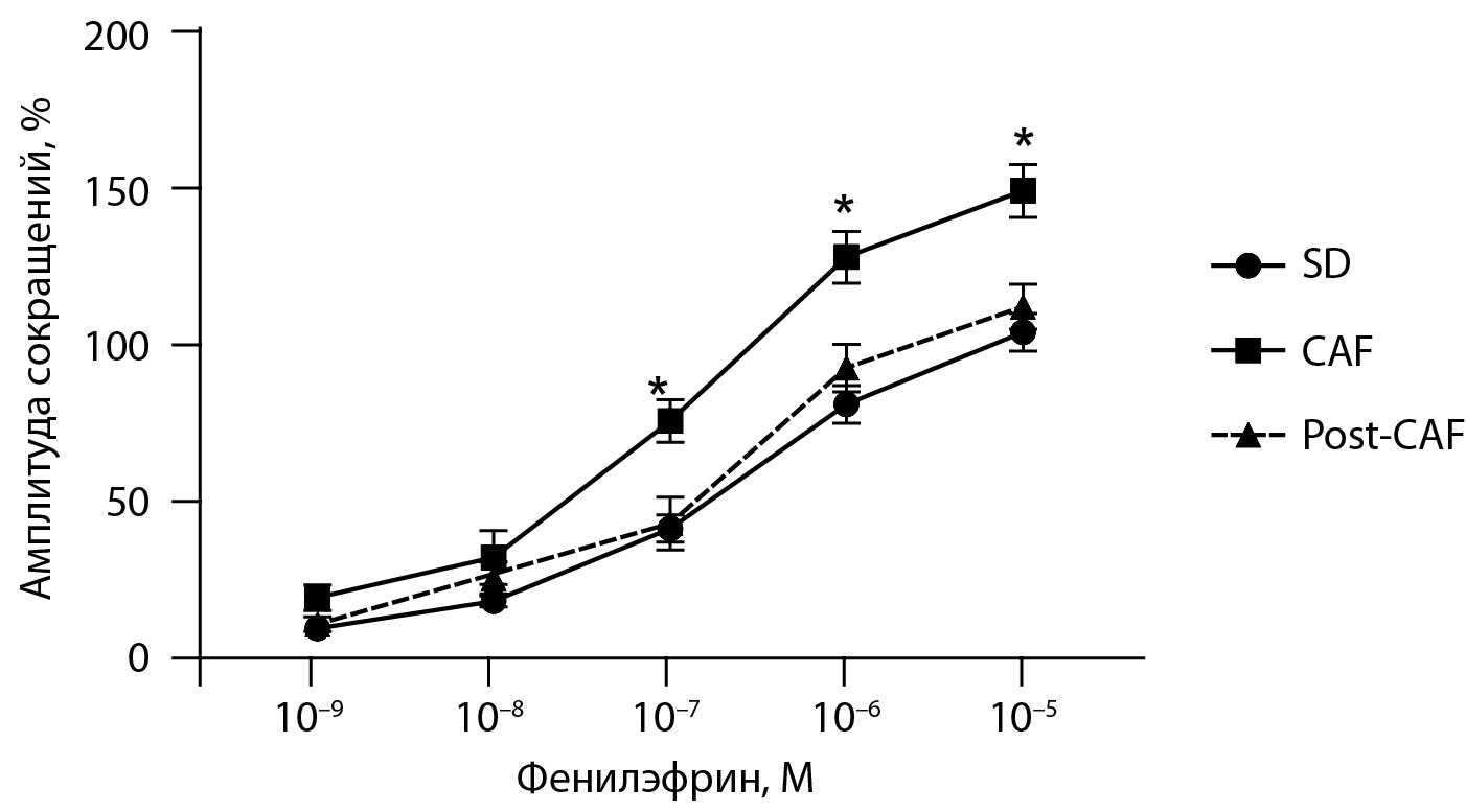 Результаты. В ходе исследования было показано, что применение CAF приводило к повышению массы тела и количества висцерального жира (в 2 раза) у опытных животных по сравнению с контролем. У них были зарегистрированы более высокие уровни в крови натощак триглицеридов 1,77±0,42 мМ vs 0,70±0,16 мМ и глюкозы 7,6±0,9 мМ vs 4,7±0,73 мМ соответственно, и показателей, полученных при проведении глюкозотолерантного теста. В Post-CAF период наблюдали снижение прибавки веса у крыс, особенно в его начале, а показатели, зарегистрированные в конце восстановительного периода, статистически не отличались от таковых в SD группе. В результате исследования реактивности аорты были получены данные о повышении величины вазоконстрикторных ответов на действие PhE в CAF группе вследствие снижения антисократительного влияния NO и участия в этом процессе калиевых каналов, блокируемых ТЭА. После Post-CAF зарегистрировано восстановление влияния NO и вклада потенциалозависимых и/или Са2+- активируемых К+-каналов гладких мышц, что в итоге приводит к возврату параметров реактивности аорты к величинам, характерным для SD группы.