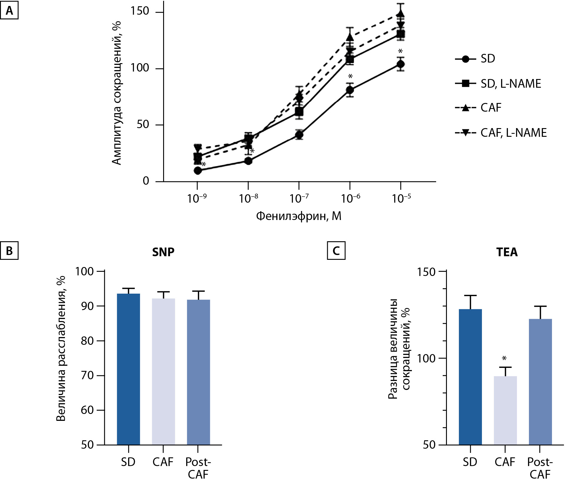 Для выявления участия NO ряд экспериментов был проведен в условиях ингибирования NO синтазы путем предварительного введения в омывающий раствор в течение 20 мин L-NAME (10-4 М). В SD и Post-CAF группах происходило усиление сократительных ответов аортальных кольцевых сегментов на введение PhE, в то время как оно практически отсутствовало в CAF группе. Дозозависимые кривые отражены на рис. 4А (в связи отсутствием статистически значимых различий в CAF и Post-CAF группах данные Post-CAF на графике не представлены). Релаксационные ответы аорты на введение экзогенного NO, полученные введением SNP (10-5 М) в PSS, не позволили выявить значимых различий во всех трех исследуемых группах (рис. 4В).