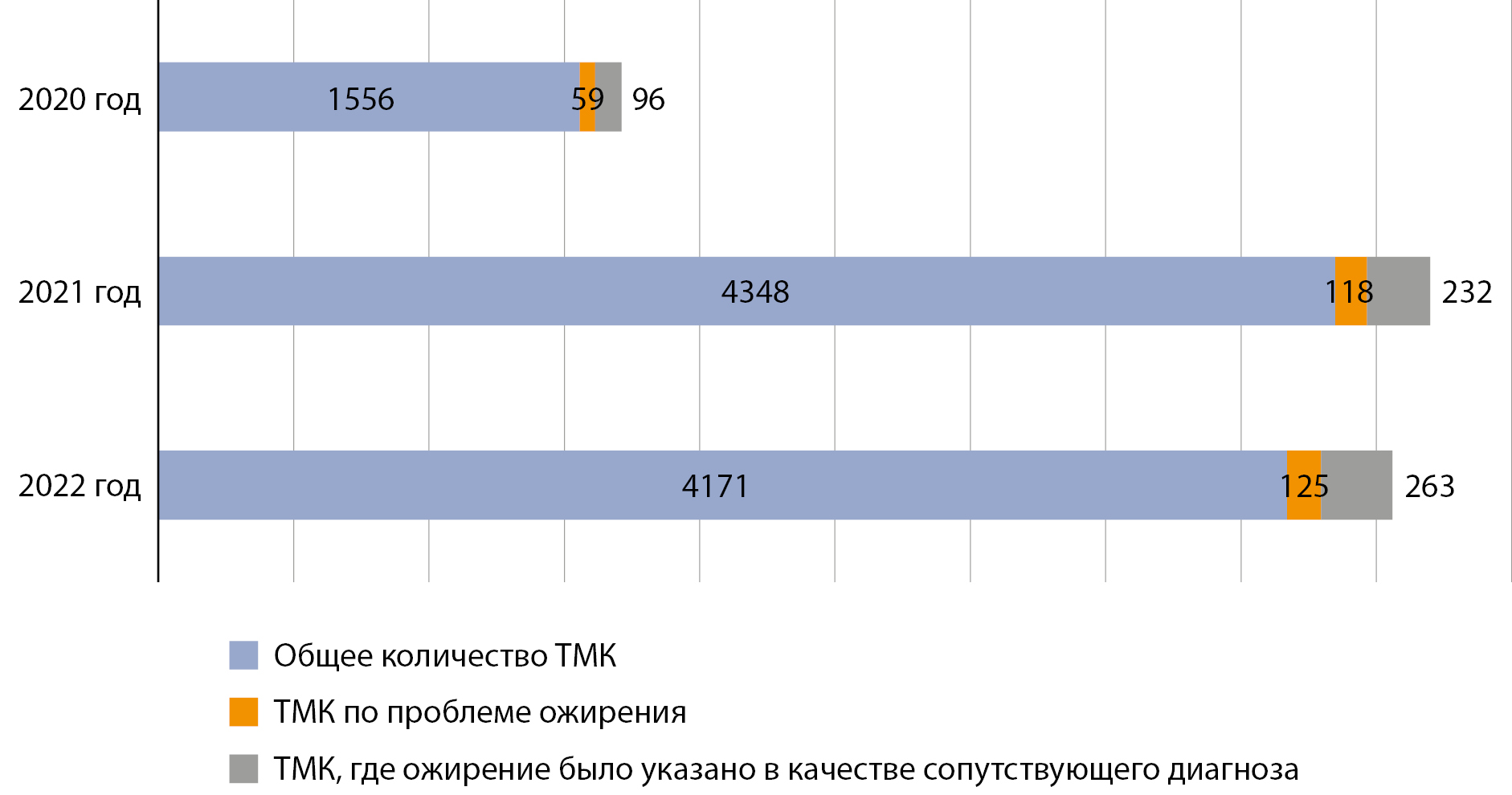 В 2022 г. отмечены практически такие же показатели, как и в 2021-м: из 4171 ТМК, проведенных в ФГБУ «НМИЦ эндокринологии», только 125 консультаций касались проблемы ожирения (2,9%), 32,8% проконсультированных пациентов были госпитализированы, 11,2% обратились за повторной консультацией.