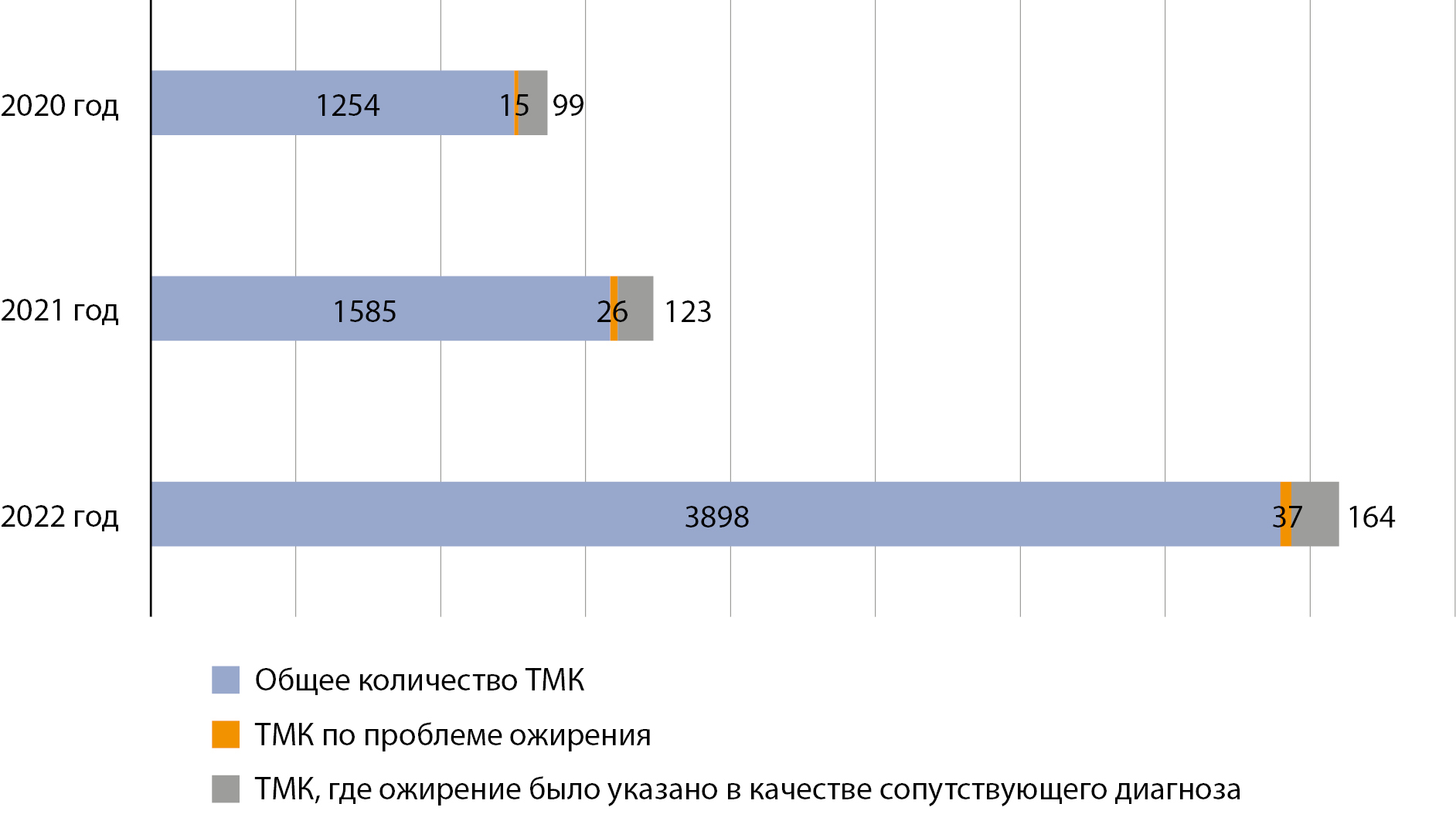 Из 1254 ТМК в 2020 г. в 99 случаях (7,9% случаев) диагноз «Ожирение» фигурировал как сопутствующий. В 2021 г. ожирение в качестве сопутствующего заболевания было указано в 7,7% случаев (123/1585), в 2022 г. — в 4,2% случаев (164/3898). Распределение ТМК из различных регионов РФ за 3 года представлены на рисунке 3.