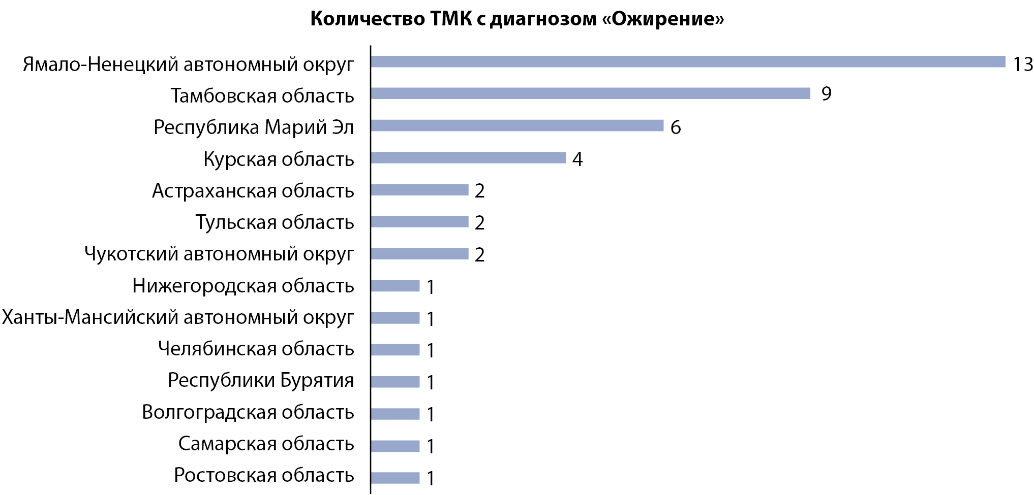 Данные, полученные при анализе структуры ТМК со специализированным научным центром в области эндокринологии, полностью отражают текущую ситуацию: проблема ожирения в РФ, по данным официальных статистических источников, серьезно недооценивается. Притом что не менее 30% взрослого населения РФ имеют ожирение [14], а среди пациентов, страдающих СД2, ожирение и избыточную массу тела имеют не менее 70% [15–16] при направлении медицинских документов на ТМК, даже в качестве сопутствующего заболевания, ожирение указывается лишь в 6,6% случаев, а в качестве основного диагноза — менее, чем в 1% случаев.