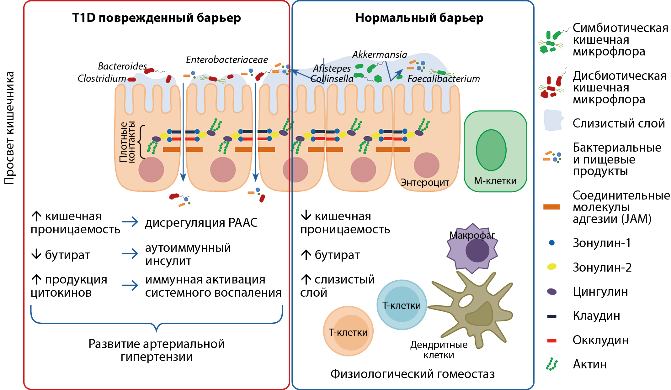 В настоящее время существует большой интерес к роли микробиома кишечника в развитии гипертонии и другой сердечно-сосудистой патологии, а также индукции и самоподдержании системного хронического воспаления. В основе нынешнего представления о микробиоме лежит мнение, что последний представляет собой гораздо больший объем клеточного и генетического материала, чем собственные клетки организма, и что биом играет ключевую роль в поддержании иммунного гомеостаза [12]. Так, например, в исследовании Harrison D., Coffman T. и соавт. показано, что изменения в микробиоте кишечника (дисбиоз) связаны с гипертонией у пациентов и в нескольких доклинических моделях [13]. Более того, согласно результатам исследования Chen X., Li P., перенос фекального материала от пациентов с гипертонической болезнью, включая женщин с преэклампсией, связан с повышением АД и воспалением у стерильных мышей-реципиентов, что позволяет предположить механистическую роль биома кишечника [14][15]. В связи с этим Santisteban M. и его коллеги предполагают, что дисбактериоз кишечника является причинным фактором развития гипертонии, которая может возникнуть в результате повышенного симпатического тонуса, снижения мезентериального кровотока и усиления системного воспаления [16]. Эта стимулированная воспалительная система может отражать изменения в соединении эпителиальных клеток, которые приводят к повышенной проницаемости эндотоксина-липополисахарида (ЛПС), мембранного компонента грамотрицательных бактерий, которые составляют большинство кишечных бактерий, а также других патогенов. Стоит отметить, что роль кишечного микробиома в патогенезе СД1 начала изучаться сравнительно недавно. Ранее проведенные исследования с использованием высокотехнологичной методики секвенирования показали значительную разницу в микробном профиле здоровых людей и пациентов с СД1, что позволяет предположить корреляцию между развитием СД1 и профилем микробиоты кишечника [17] (рис. 1).