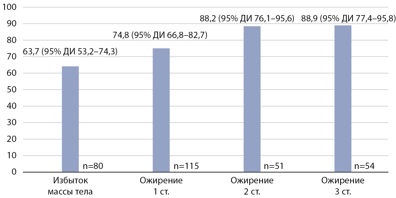 У 76,7 (95% ДИ 71,9–81,5)% пациентов с ожирением выявлен синдром гипогонадизма. Частота встречаемости гипогонадизма увеличивается по мере возрастания избытка жировой массы. Наличие гипогонадизма ассоциировано с дислипидемией и гиперурикемией.