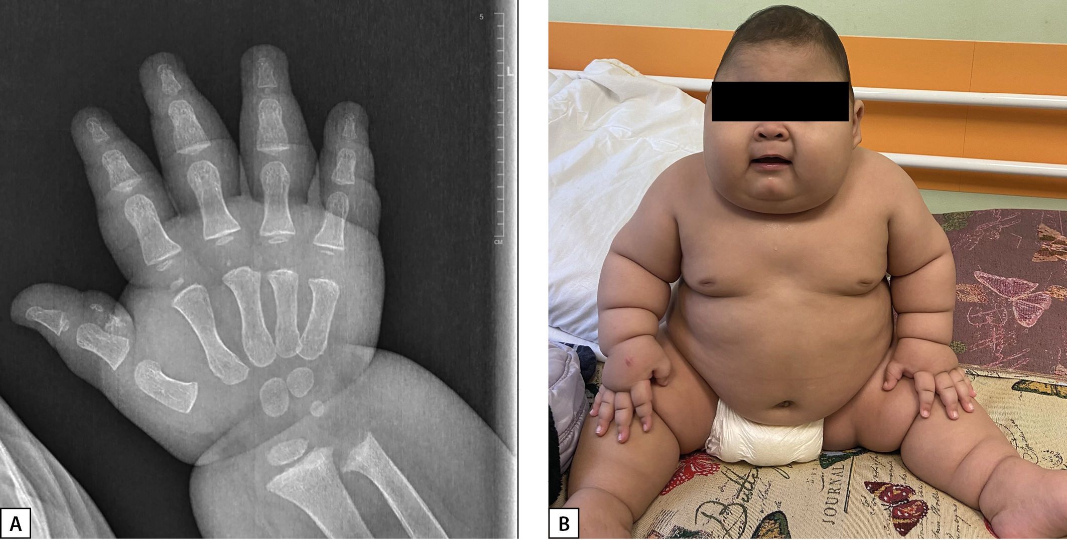 Рисунок 1. Фенотипические особенности у мальчика с ПГП 1а: А — Брахидактилия и подкожные кальцинаты (рентгенография кистей с лучезапястными суставами); В — лунообразное лицо, морбидное ожирение.
