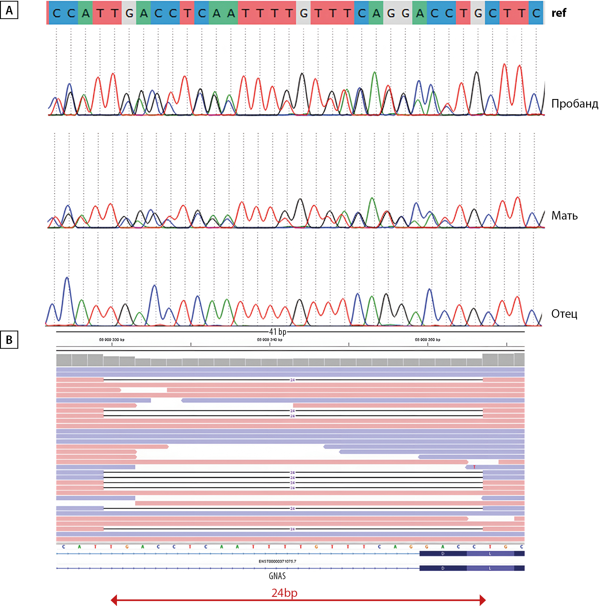 2. Рисунок 2. Вариант NM_000516.7(GNAS):c.586-18_591del: A. Электрофореграммы пробанда и родителей. Б. Изображение делеции в графическом браузере IGV [27].