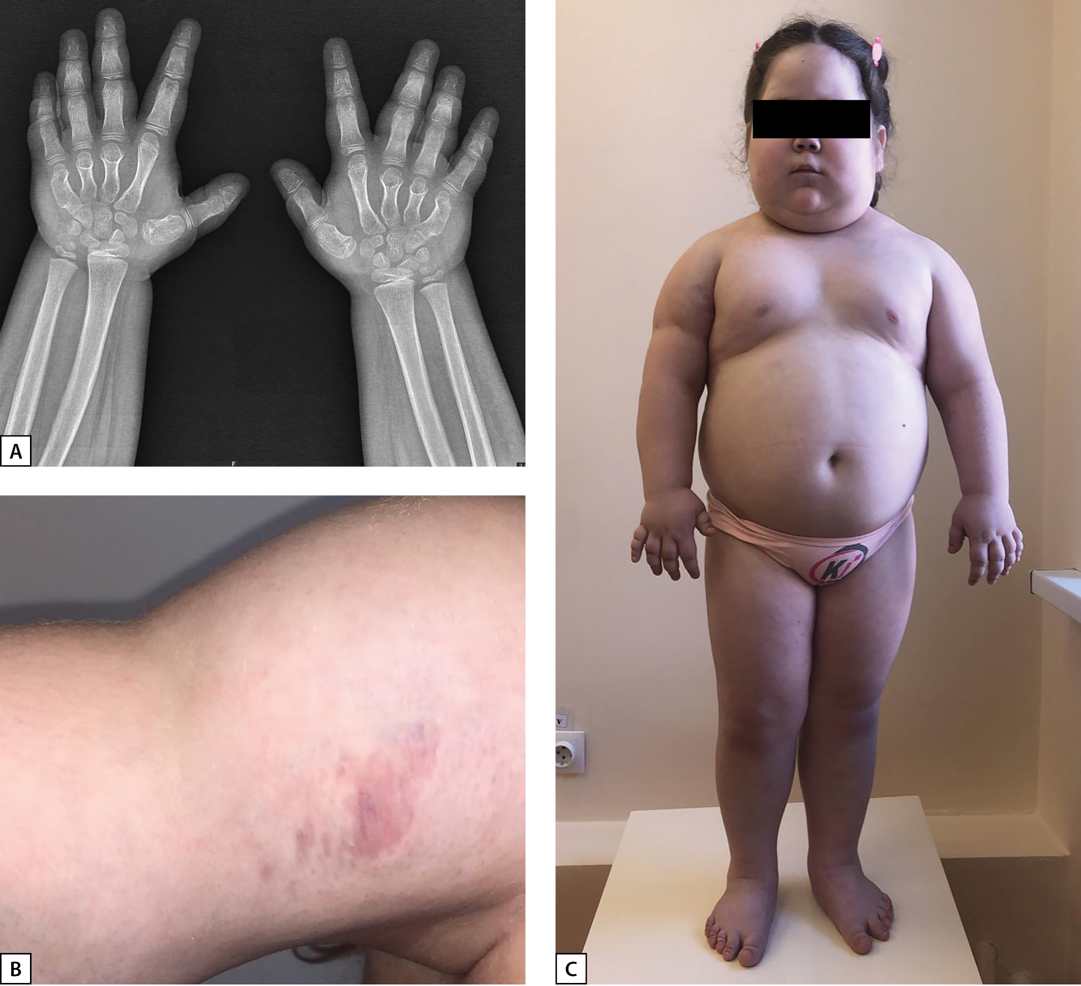 3. Рисунок 3. Фенотипические особенности у девочки с ПГП Ia: A. Брахидактилия (рентгенография кистей с лучезапястными суставами). B. Подкожные кальцинаты. C. Лунообразное лицо, морбидное ожирение.