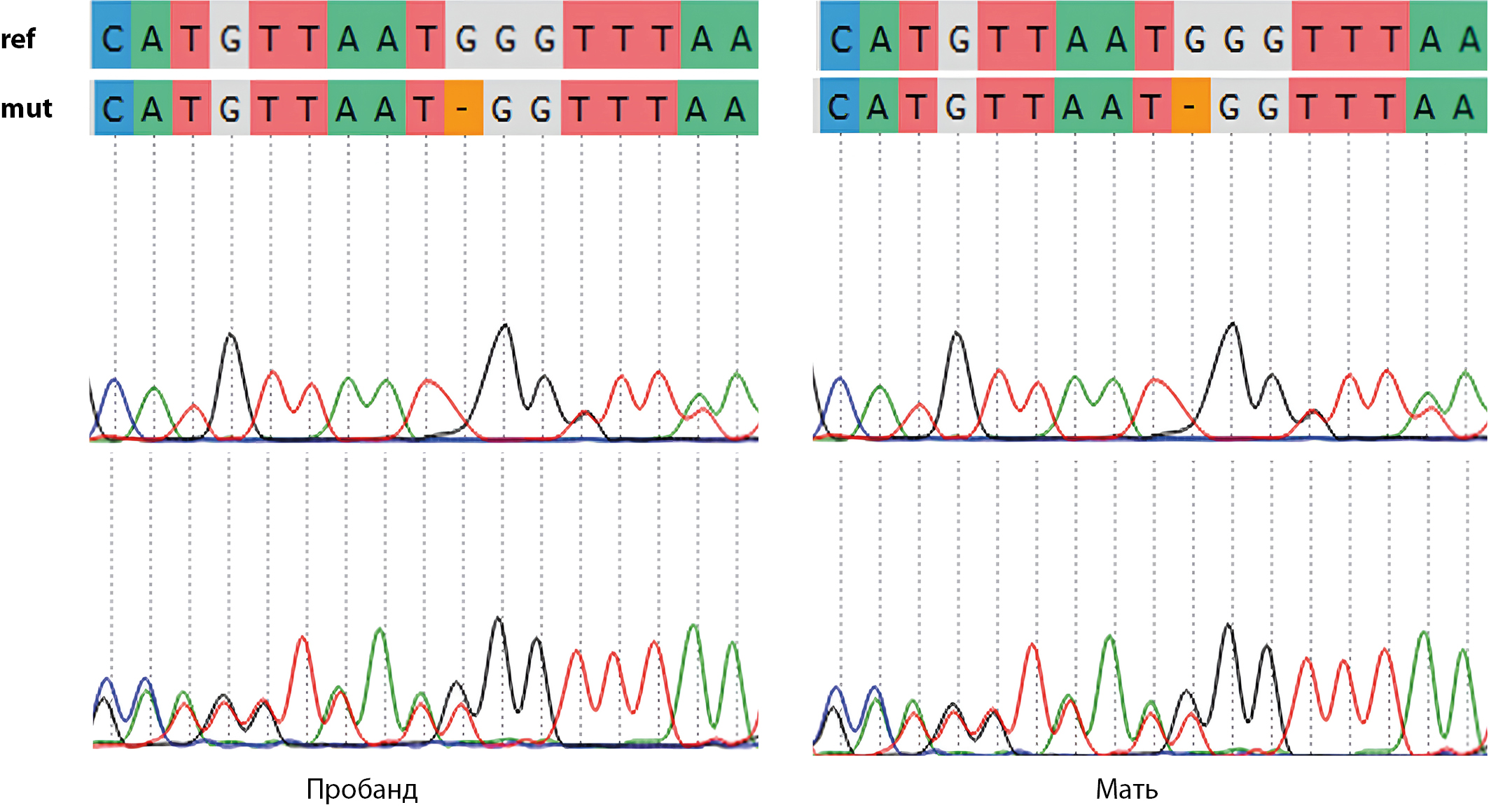 4. Рисунок 4. Вариант NM_000516.7(GNAS):c.201del, (p.Phe68LeufsTer32), выявленный у пробанда и матери.
