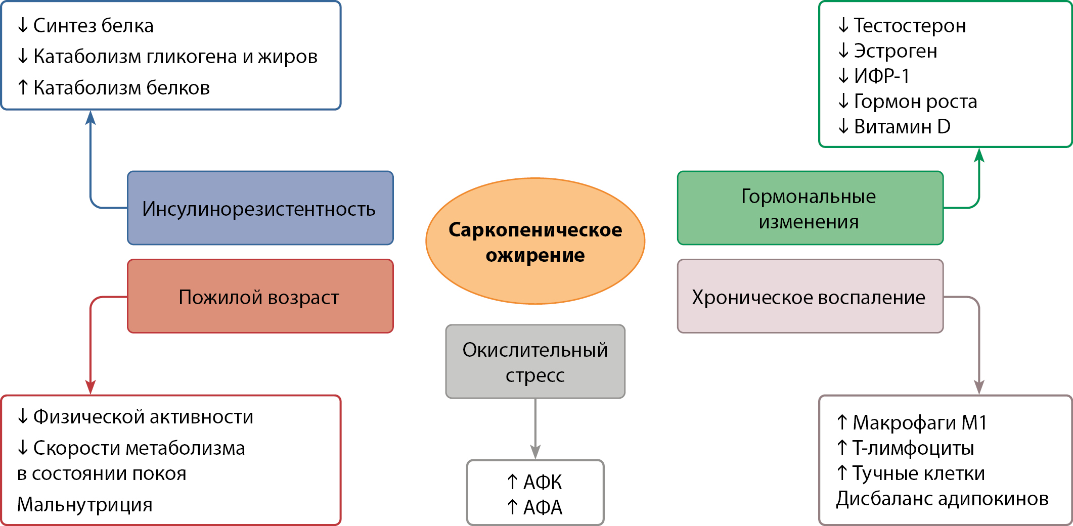Рисунок 1. Факторы риска и основные звенья развития саркопенического ожирения.