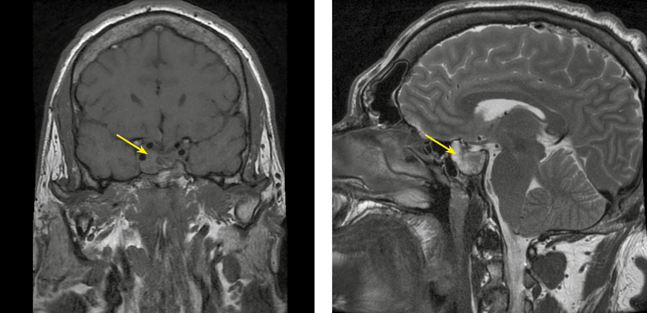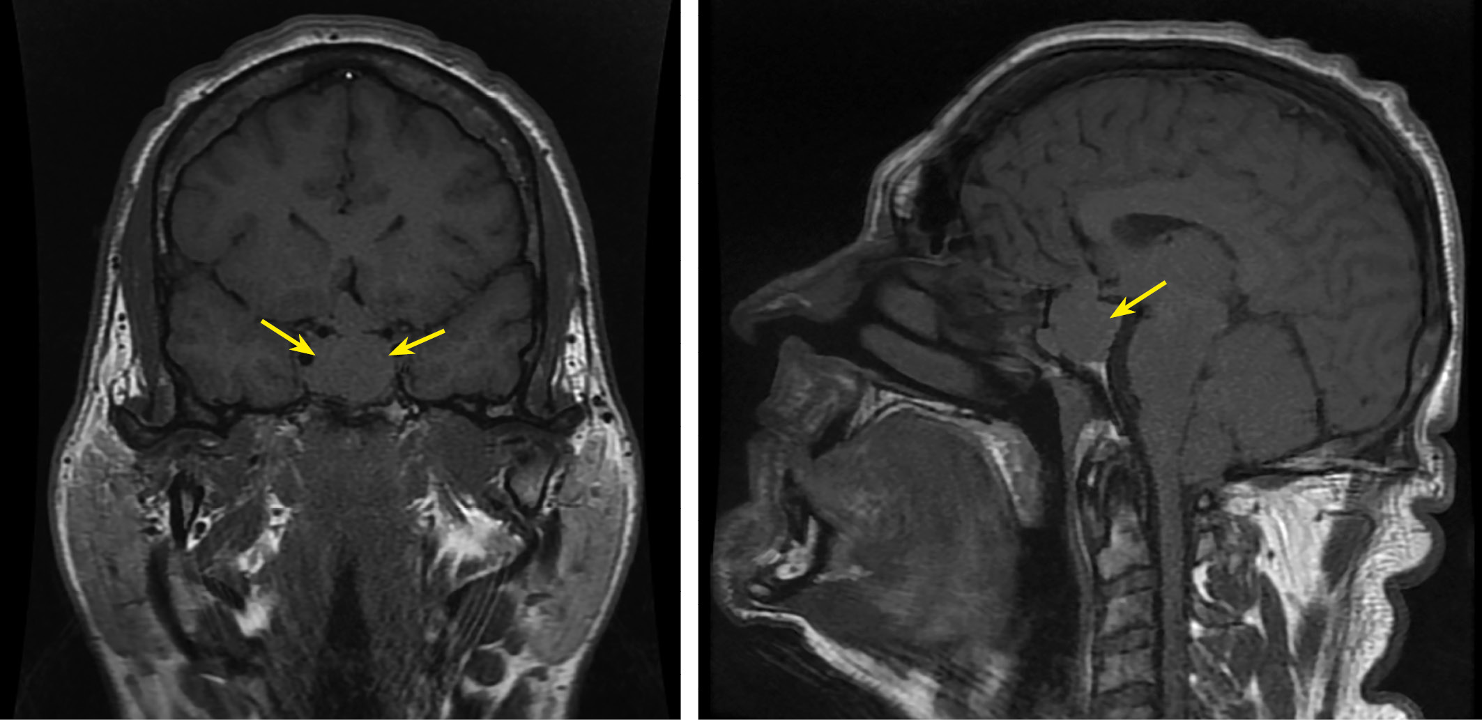 в полости турецкого седла, в супраселлярной цистерне, в области дна третьего желудочка, в правом кавернозном синусе, в пазухах основной кости имеется многоузловое объемное образование неоднородной структуры размерами: вертикальный — 36 мм, поперечный — 33 мм, переднезадний — 26 мм, образование деформирует, смещает и компримирует хиазму, деформирует медиальную стенку левого кавернозного синуса; при контрастном усилении характеризуется сниженным (по сравнению с тканью аденогипофиза) накоплением контрастного препарата.