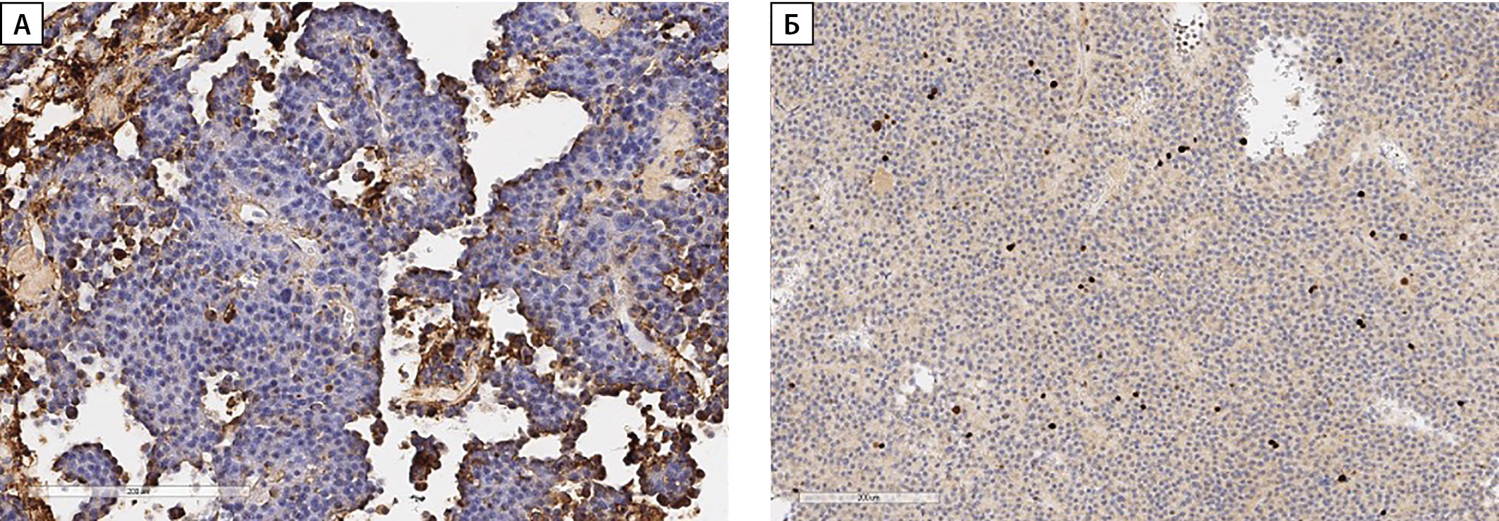 Пациенту Д. выполнена трансназальная транссфеноидальная аденомэктомия. В послеоперационном периоде при проведении СТГ в ходе ОГГТ максимальное подавление до 6,1 нг/мл на 90 минуте. По данным иммуногистохимического исследования определена редкогранулированная соматотропинома: очаговое, слабо выраженное окрашивание цитоплазмы опухолевых клеток с антителами к СТГ, экспрессия САМ 5.2 в виде фиброзных телец, индекс метки Ki-67 6,0%, выявлена выраженная экспрессия рецепторов соматостатина 2 подтипа на мембране более 80% опухолевых клеток (12 баллов по IRS), экспрессия Pit1 в большинстве опухолевых клеток, экспрессия пролактина в опухолевых клетках не обнаружена (рис. 2а, 2б).