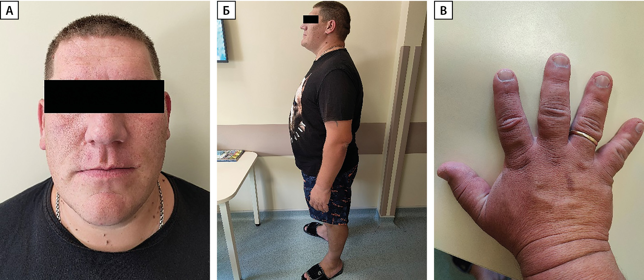 При поступлении пациент предъявлял жалобы на повышенную потливость, отечность лица и нижних конечностей к вечеру, нарушение дикции, изменение прикуса, храп. При объективном осмотре отмечались изменения в виде увеличения языка, выступания грудной клетки и нижней челюсти несколько вперед, расхождение зубов, формирование кожных складок по всей поверхности головы. Телосложение гиперстеничное, масса тела составляла 142 кг при росте 181 см, индекс массы тела (ИМТ) — 43,3 кг/м2.