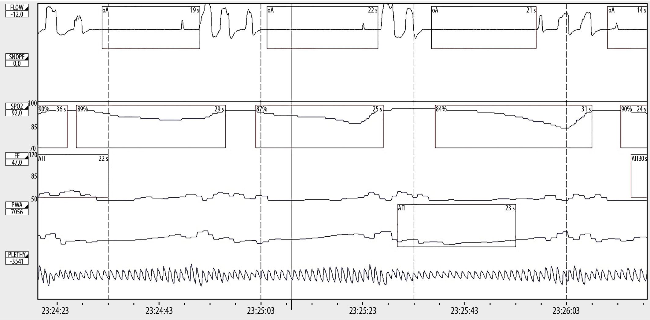 Обращало на себя внимание, что при поступлении пациент не предъявлял жалоб на нарушение сна, хотя до операции его беспокоил храп. В связи с наличием морбидного ожирения выполнен кардиореспираторный мониторинг. Индекс апноэ-гипопноэ составил 47,6 событий/ч при норме до 5 событий/ч, что соответствует тяжелой степени апноэ (из них 39,2 обструктивных событий/ч). Храп составил всего лишь 3% от всей записи. Среднее значение насыщения крови кислородом составило 92% (при норме 94–98% в ночное время), минимальное снижение сатурации — до 70%. Средняя длительность апноэ по 16 сек., максимально — до 53 сек (рис. 5).