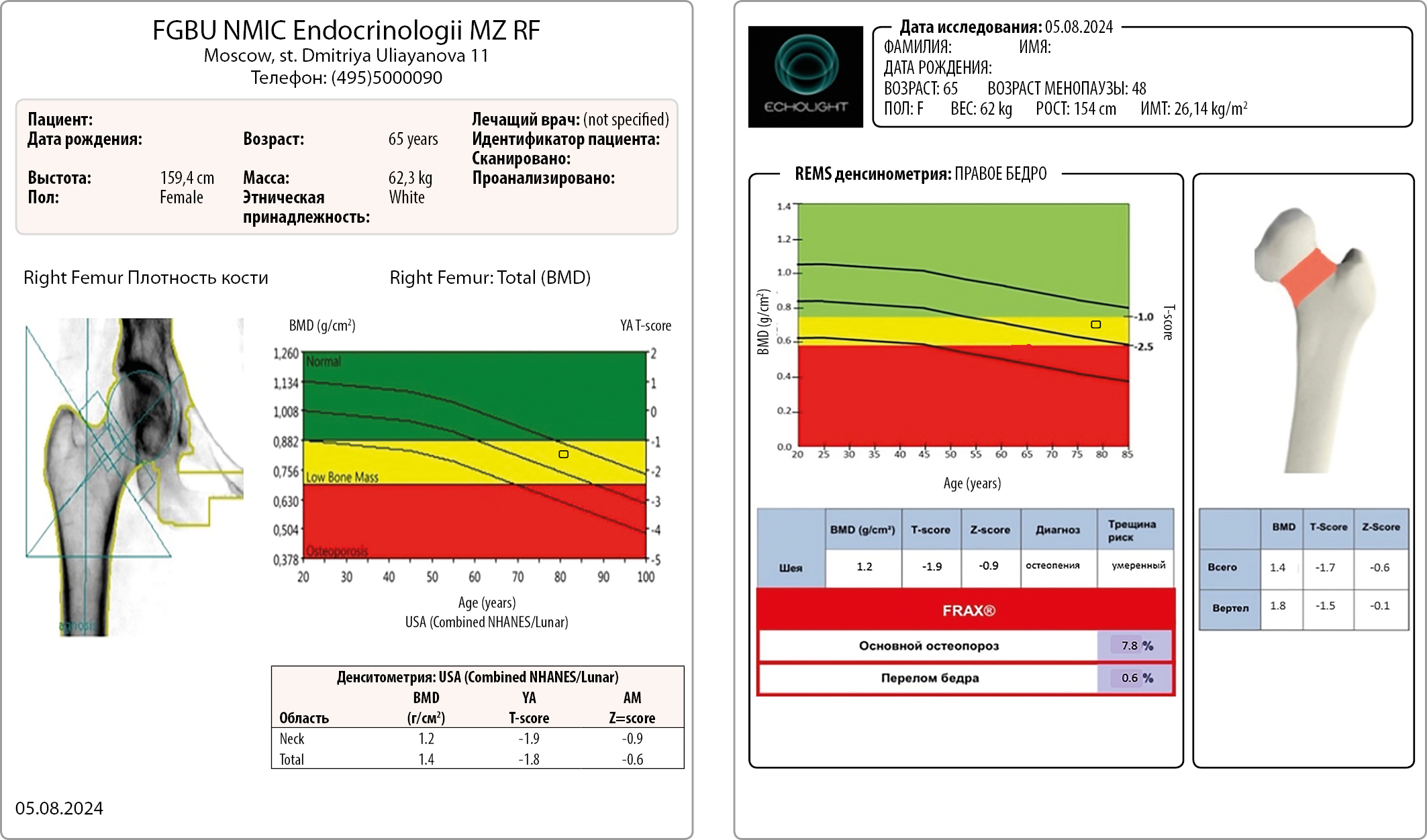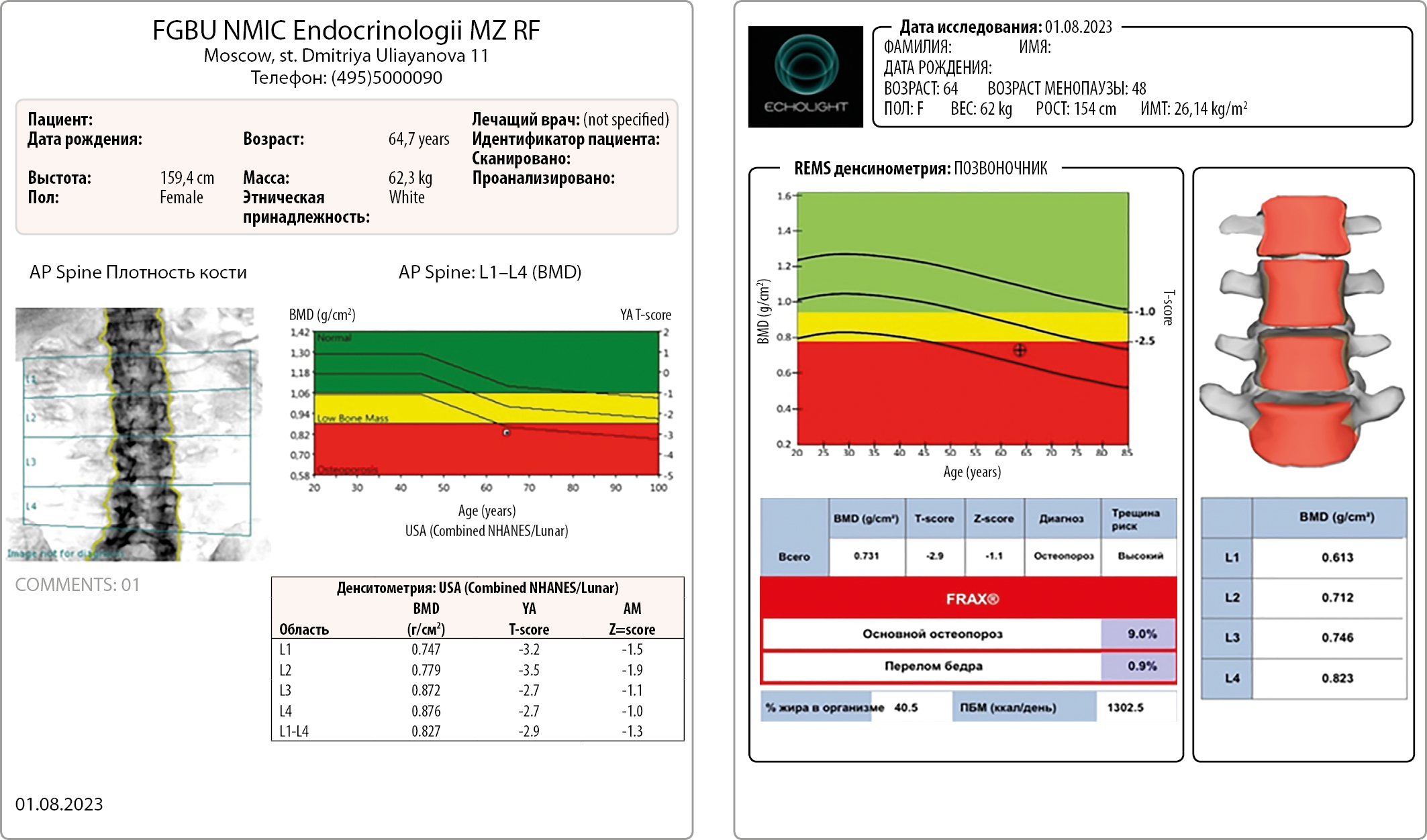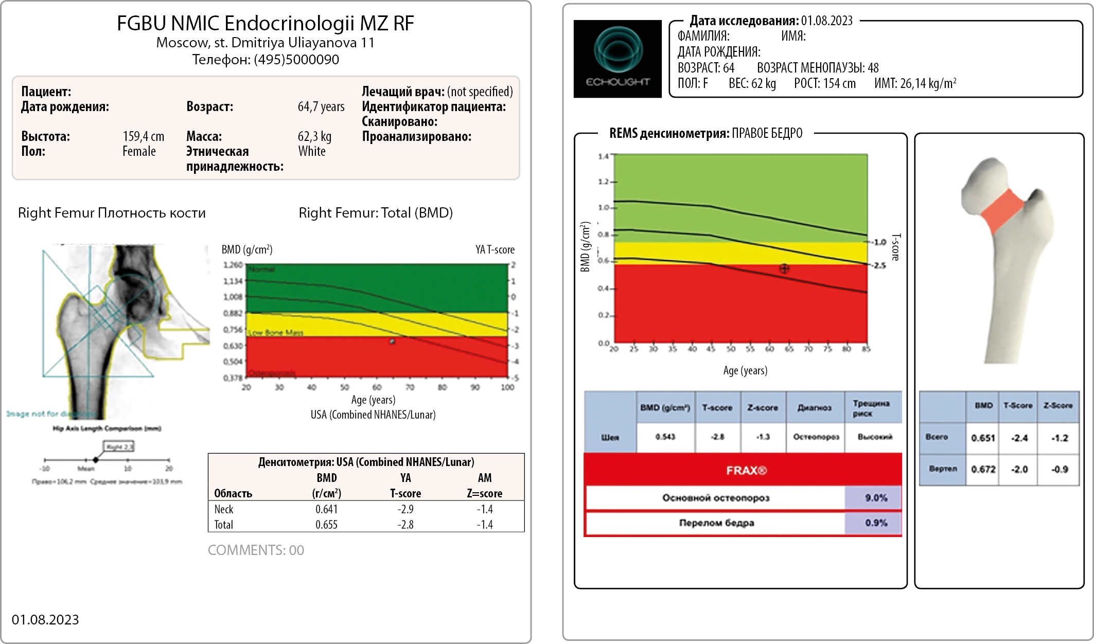 При обследовании в ГНЦ РФ ФГБУ «НМИЦ эндокринологии» Минздрава России в августе 2023 г. подтверждена ремиссия основного заболевания: уровень пролактина в сыворотке крови — 358 мЕд/л, признаки аденомы гипофиза отсутствуют. Тиреоидные гормоны — в пределах референсного диапазона, отмечалось снижение уровня эстрадиола до 13 пг/мл (97–592). Таким образом, учитывая относительно раннее наступление менопаузы, отсутствие заместительной гормональной терапии, гипогонадизм персистирует в течение 17 лет. По результатам проведенной в стационаре рентгеновской денситометрии (DXA) диагностирован остеопороз с максимальным снижением МПК в поясничном отделе позвоночника и в области бедренной кости до -2,9 SD по Т-критерию. Дополнительно выполнено исследование МПК методом радиочастотной эхографической мультиспектрометрии (REMS), данные которого были полностью сопоставимы с DXA (рис. 1 и 2) — поясничный отдел позвоночника и бедренная кость -2,9 SD по Т-критерию. Согласно анализу крови выявлено снижение маркера костеобразования и повышение параметров костной резорбции: остеокальцин — 7 нг/мл (15–46), C-концевой телопептид коллагена I типа (β-Cross laps) — 2,8 нг/мл (менее 1,008), уровень кальция на нижней границе нормальных значений — 2,16 ммоль/л (2,15–2,5), фосфор в сыворотке крови — 1,1 ммоль/л (0,81–1,45). Известно, что имеется снижение в росте в течение жизни на 5 см. Пациентке инициирована терапия деносумабом 60 мг подкожно 1 раз в 6 месяцев с дополнительным назначением препарата нативного витамина D — колекальциферол 7000 МЕ/сутки в течение 8 недель с дальнейшим переходом на прием 2000 МЕ/сутки длительно и карбоната кальция 500 мг/сутки.