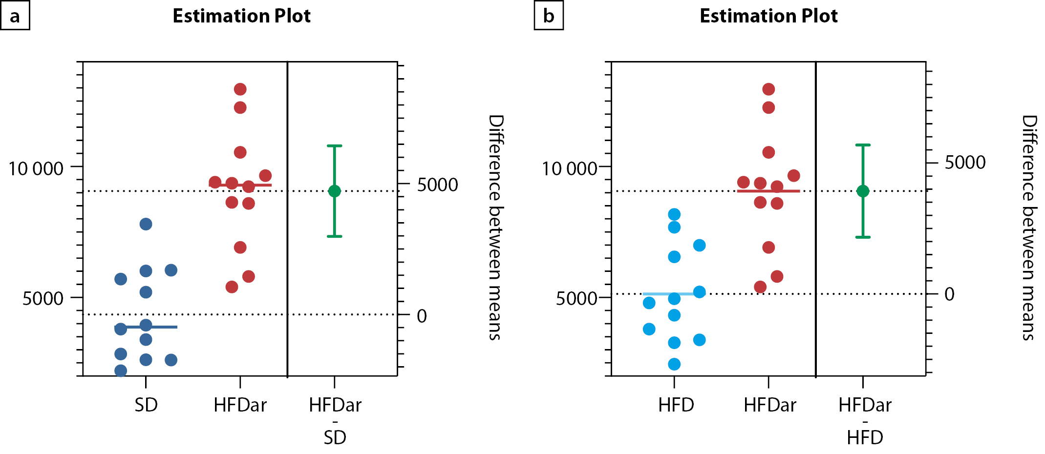 2. Figure 2. Differences in the representation of the salvage of adenosylcobalamine from the cobinamide I pathway in the microbiome of the large intestine of mice received an SD compared to HFD+C15 (HFDar) (a) or an HFD compared to HFD+C15 (b). Unpaired t test with Welch’s correction was applied, p < 0.001.