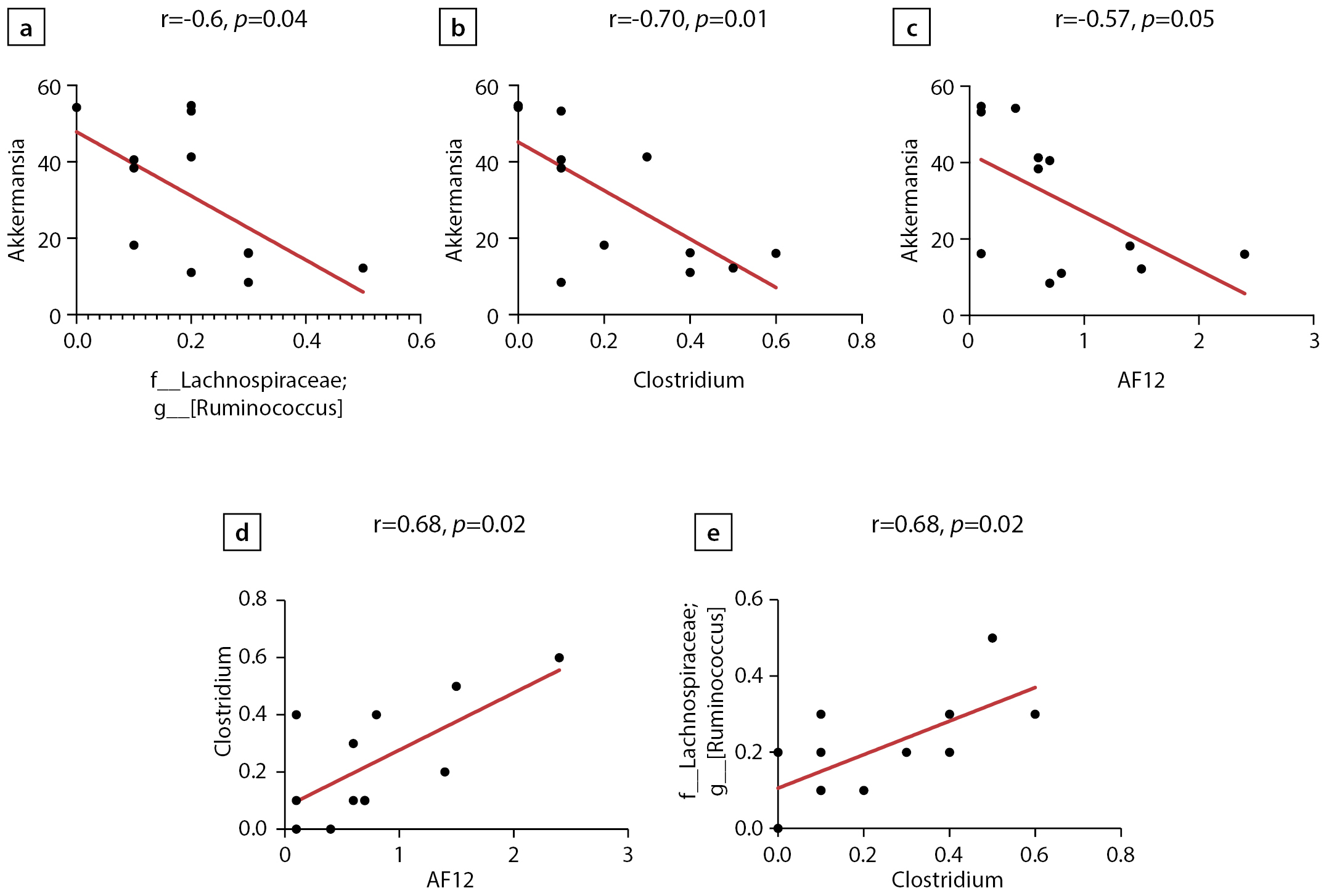 3. Figure 7. Correlation analysis of microbe representation in the large intestine of mice received an HFD+C15. Spearman correlations are shown for: a — Akkermansia and [Ruminococcus], b — Akkermansia and Clostridium, c — Akkermansia and AF12, d — Clostridium and AF12, e — Clostridium and [Ruminococcus] genera.