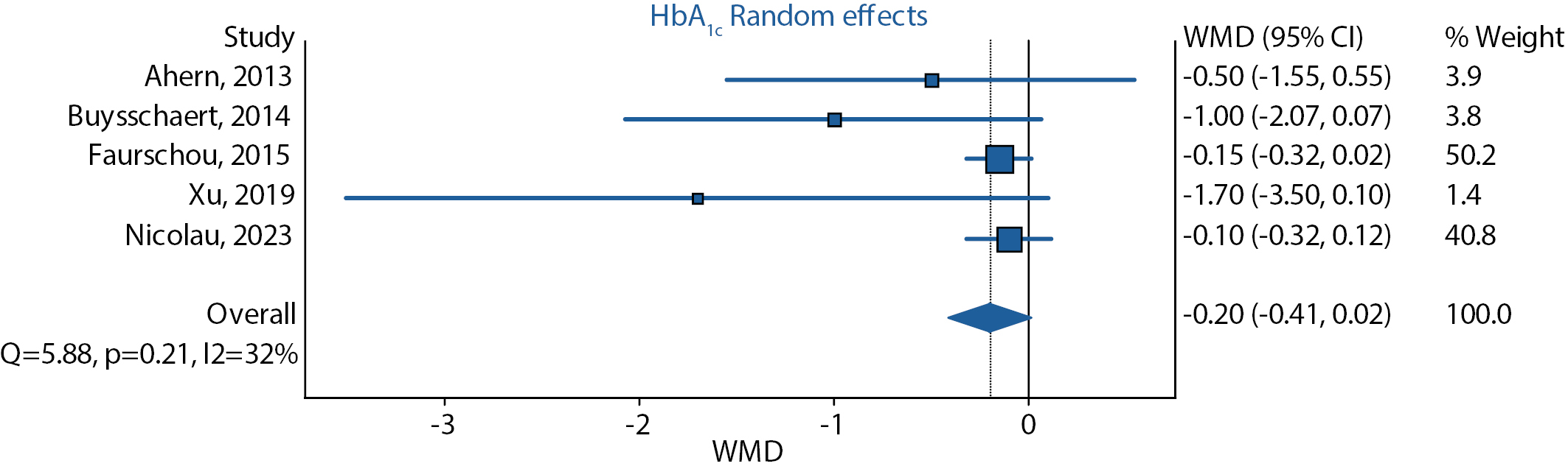 По результатам проведенного анализа на основе всех 5 исследований на фоне терапии лираглутидом не отмечено значимого снижения средневзвешенной разницы уровня гликированного гемоглобина (-0,20 [ 95% ДИ -0,41; 0,02]) при незначительной гетерогенности (I2=32%, p=0,21) (рис. 5).