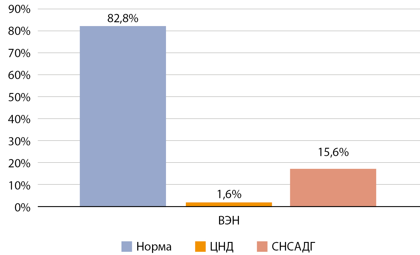 Нами была изучена частота водно-электролитных осложнений у пациентов после трансназальной аденомэктомии. За период наблюдения с 2021 по 2022 гг. проанализировано 122 пациента, им проводился регулярный контроль уровня натрия крови, по результатам которого водно-электролитные осложнения выявлены у 21 (17,2 %), из которых синдром неадекватной секреции антидиуретического гормона (СНСАДГ) диагностирован у 19 (15,6%), центральный несахарный диабет — у 2 (1,6%), что демонстрирует высокую распространенность гипонатриемии среди прооперированных пациентов (рис. 1).