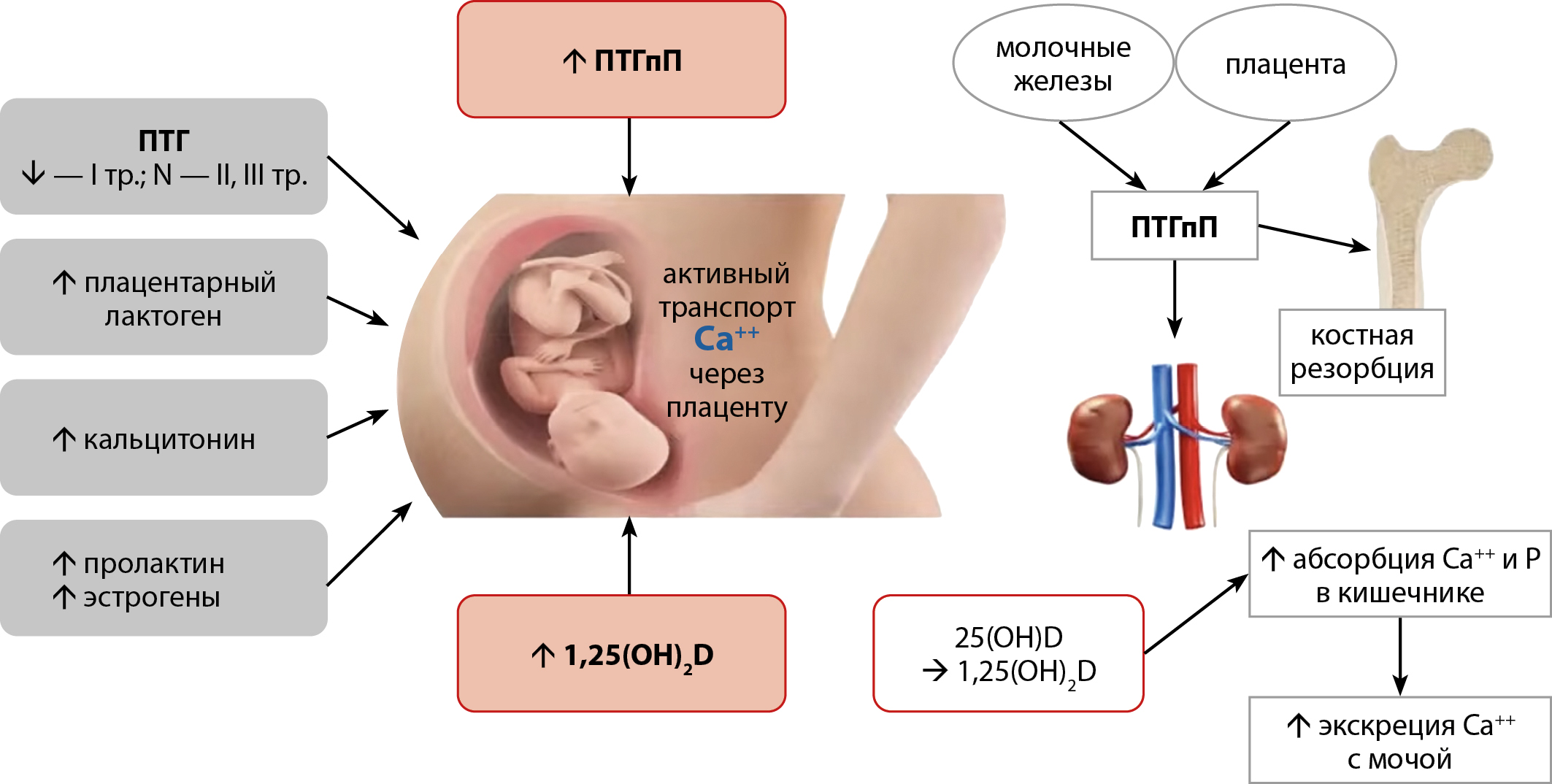 ПТГпП во время беременности синтезируется в большом количестве плацентой, молочными железами, децидуальной оболочкой, максимальных значений его сывороточная концентрация достигает на позднем сроке беременности. Аминотерминальная часть молекулы пептида, структурно напоминающая ПТГ, стимулирует резорбцию костной ткани, усиливает реабсорбцию Са почками и ускоряет его транспорт через плаценту, а карбокситерминальная подавляет активность остеокластов, предотвращая таким образом избыточное повреждение костей [24][41] (рис. 2).