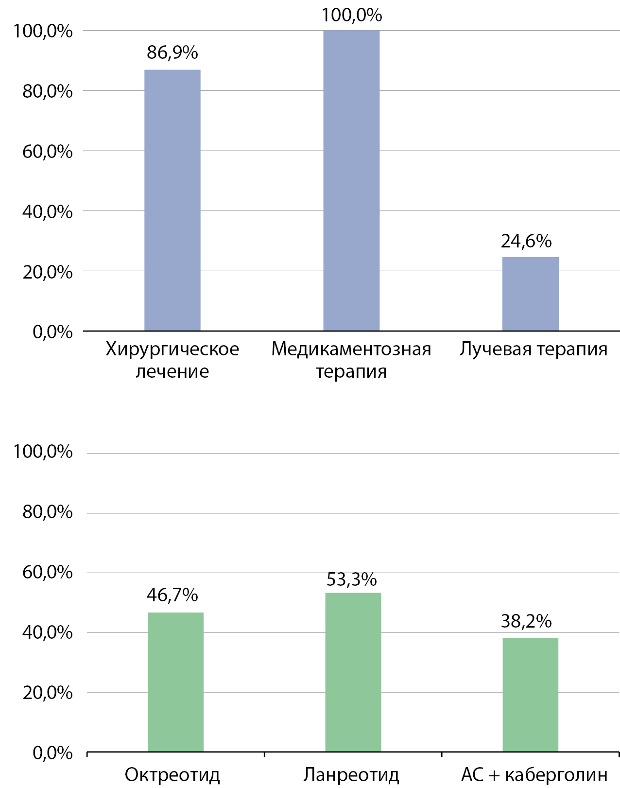 На эффективность медикаментозной терапии существенное влияние оказывает оптимальный выбор препарата для быстрого достижения контроля заболевания. По данным регистра ОГГО, октреотид получают 75,7% больных акромегалией, ланреотид — 18,9%, каберголин — 16,5%, ПЭГ — 3,7%, бромокриптин — 2,8%. Несвоевременное назначение доступных препаратов второй линии при неэффективности терапии первой линии, в том числе может объяснять недостаточную эффективность лечения акромегалии в нашей стране [11].
