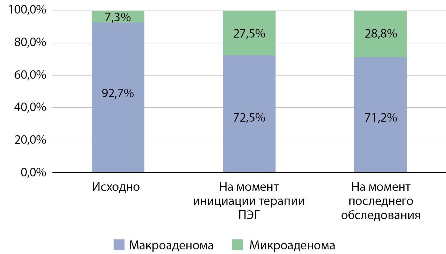 Биохимическая ремиссия акромегалии на фоне лечения ПЭГ была достигнута в 85 (70,8%) случаях.