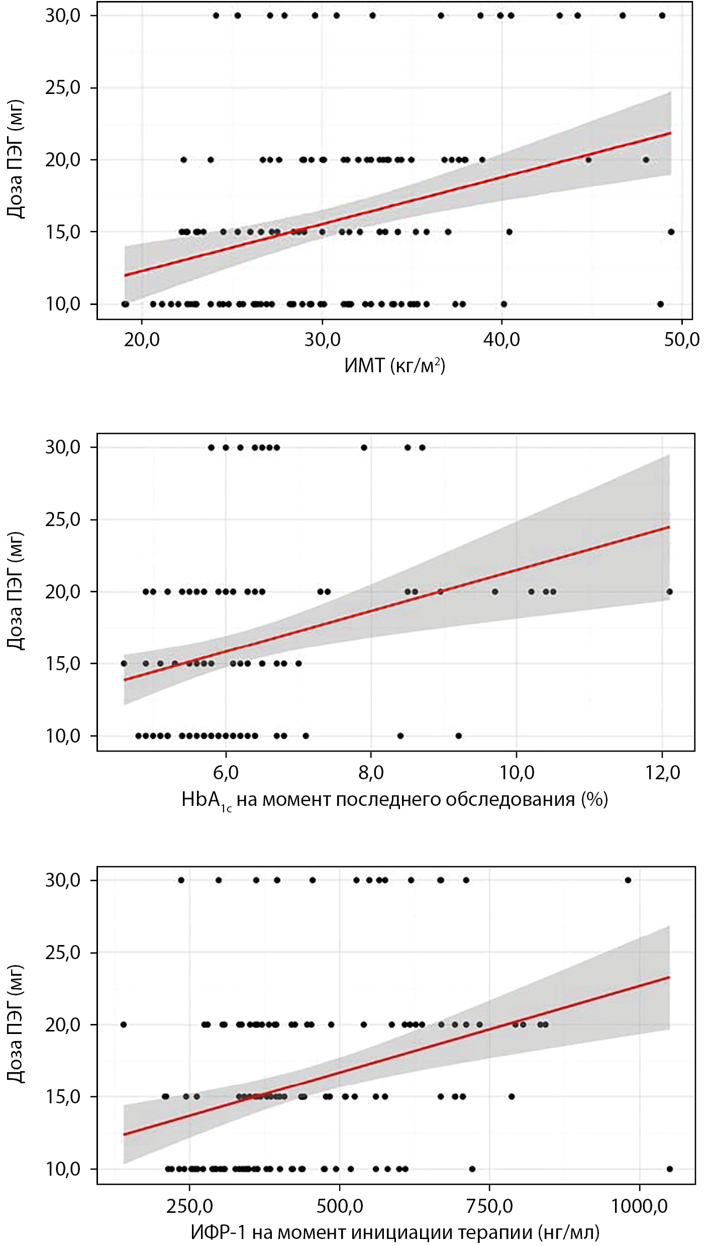 Корреляционный анализ по Спирмену показал наличие прямой зависимости между дозой ПЭГ, получаемой на момент последнего обследования, и последними значениями ИМТ (r=0,33; р<0,001) и уровня HbA1c (r=0,32; р<0,001). Также отмечена прямая корреляция между получаемой дозой ПЭГ и уровнем ИФР-1 на момент инициации терапии (r=0,39; р<0,001) (рис. 4).