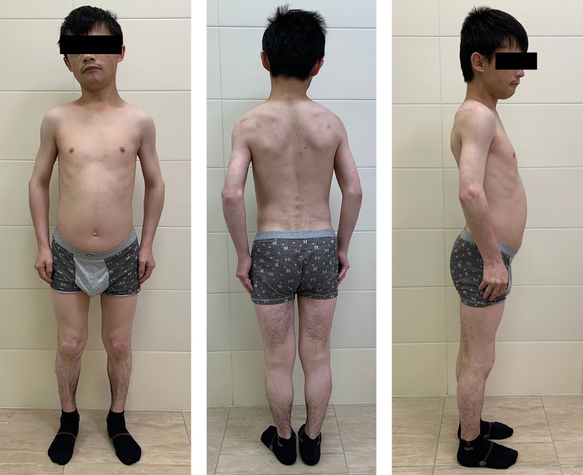 По данным физикального обследования: масса тела — 37,0 кг, рост — 143,5 см, индекс массы тела (ИМТ) — 18,0 кг/м² (рис. 1), бледность кожных покровов, одутловатость лица, параорбитальный отек, язык увеличен. Телосложение диспропорциональное, пропорции тела хондродистрофического типа, коэффициент «верхний сегмент/нижний сегмент» = 1,3:1 (норма для взрослого 1,1–0,9:1), что, вероятно, связано с нарушением эпифизарного роста костей. Отмечалась псевдогипертрофия мышц пояса верхних и нижних конечностей, мышечная сила диффузно снижена до четырех баллов, тонус симметрично повышен, сухожильно-периостальные рефлексы высокие, с расширением рефлексогенных зон. Движения в крупных суставах ограничены за счет мышечных контрактур. Походка с элементами атаксии, скованная, при передвижении держится за руку. Щитовидная железа не увеличена, безболезненна, узловые образования не пальпируются. У пациента отмечалось скудное оволосение лица, подмышечных впадин, паховой области (Tanner Р2), половые органы развиты соответственно возрасту (Tanner G5).