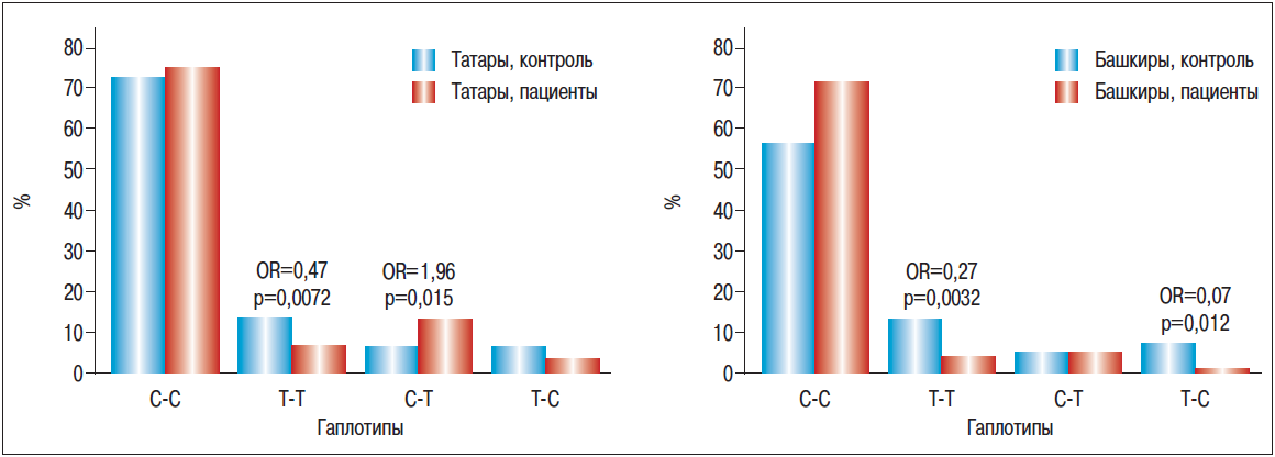 Ассоциация с риском развития МС показана в группе татарок для гаплотипа C-T, поскольку в контрольной группе на его долю приходилось 6,7% по сравнению с 13,5% среди пациенток с МС. Показатель отношения шансов OR составил 1,96 (95% CI 1,14–3,36), p=0,015. Показано, что гаплотип Т-Т ассоциирован с устойчивостью к развитию МС. В группе пациенток-татарок с МС частота этого гаплотипа составила 13,9%, тогда как в контрольной группе на его долю приходилось 7,0%. Показатель отношения шансов OR составил 0,47 (95% CI 0,27–0,81, p=0,0072).