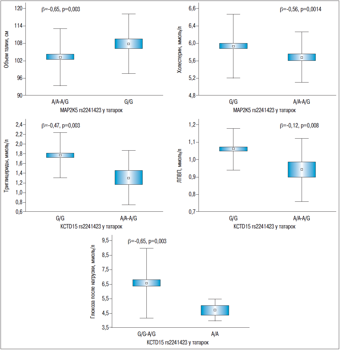 В нашей работе также показана ассоциация полиморфных маркеров rs2241423 гена MAP2K5 и rs11084753 гена KCTD15, ассоциированных с количественными признаками метаболических нарушений у татарок, и полиморфных маркеров rs2241423 гена MAP2K5 и rs174550 гена FAD1, ассоциированных с количественными признаками метаболических нарушений у башкирок.