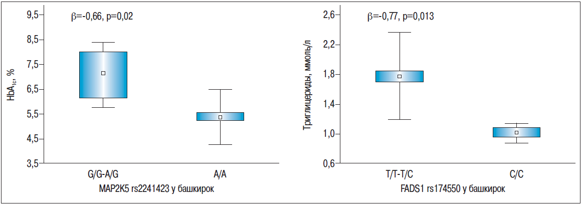 В группе башкирок ассоциация уровня гликированного гемоглобина (HbA1с) была определена с маркером rs2241423 гена MAP2K5 в рецессивной модели (р=0,002). Ассоциация с уровнем триглицеридов показана для локуса rs174550 гена FADS1 в рецессивной модели (р=0,02) только в группе женщин башкирской этнической принадлежности.