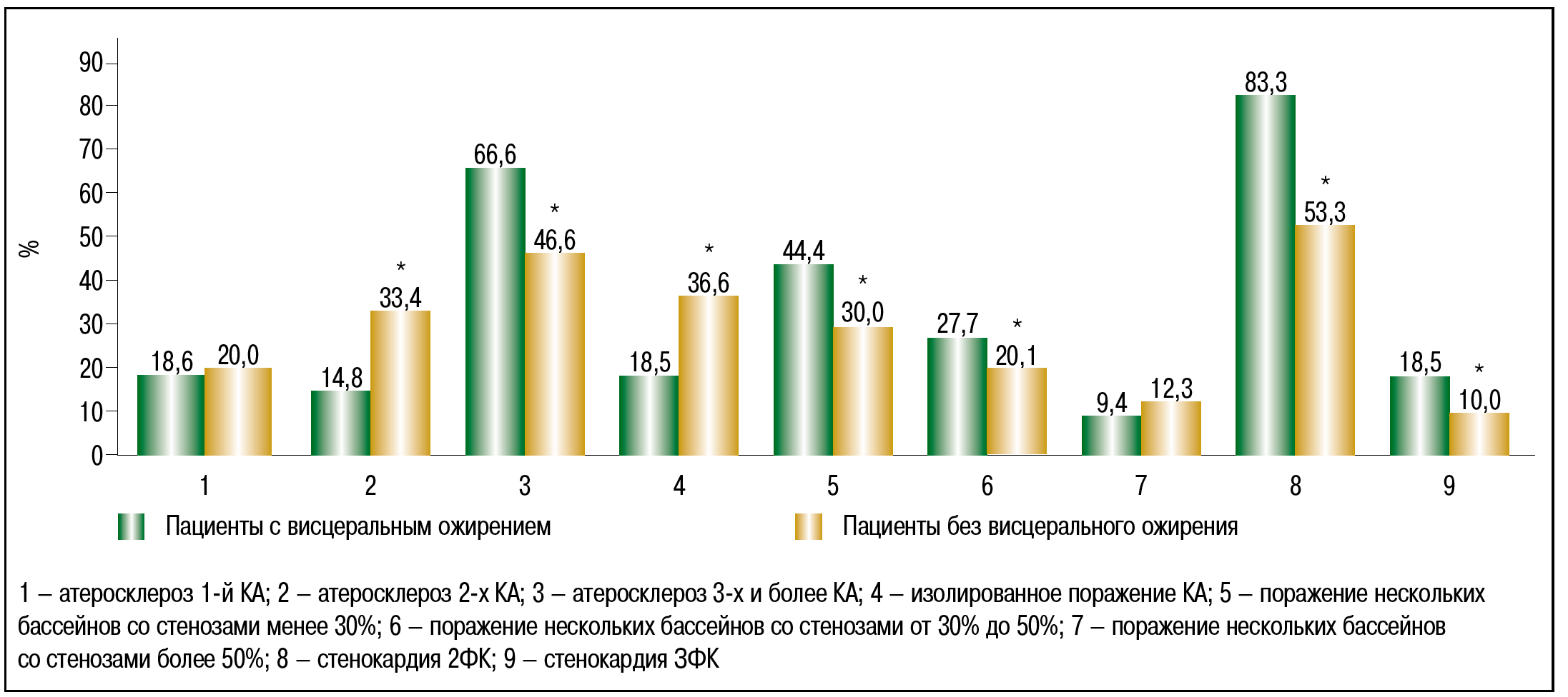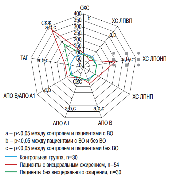 2. Рис. 2. Показатели липидного обмена больных ИБС в зависимости от наличия висцерального ожирения | |